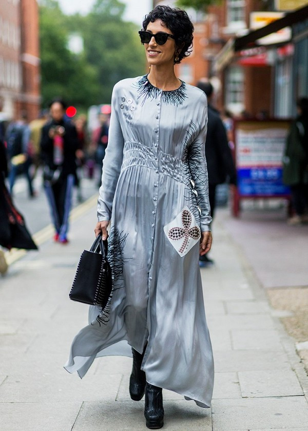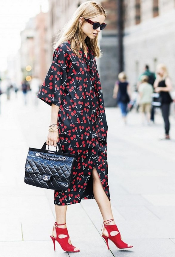 Необычно и интересно выглядят платья с мюлями на невысоком каблуке. Акцент можно сделать на сумке или массивных аксессуарах: серьгах, кольце, ожерелье. Некоторые девушки украшают образ шляпками. Это выглядит современно и аристократично.