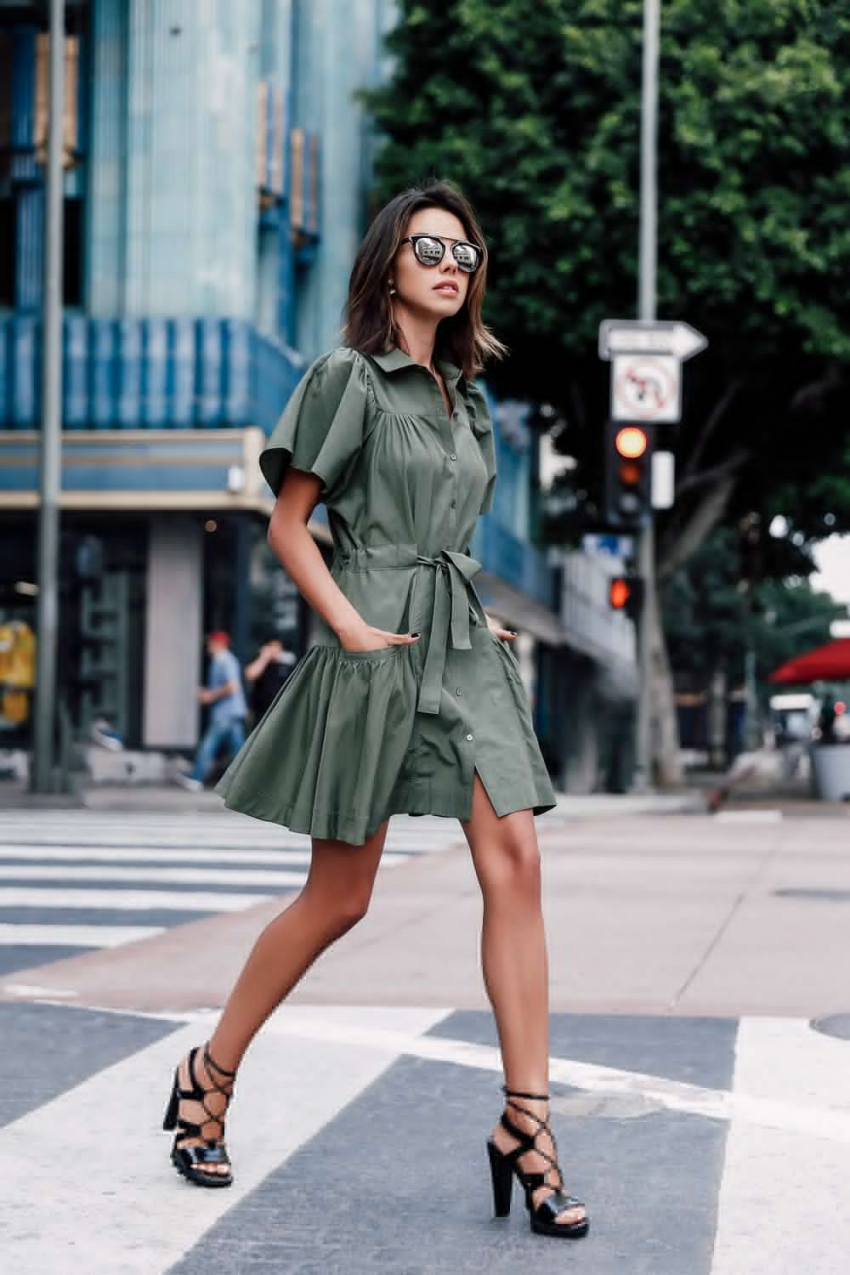 Сочетать платье-рубашку с рукавом-фонариком следует с туфлями, мюлями и босоножками. Кеды или кроссовки в этот образ впишутся только в том случае, если одежда до колена. Иные образы будут смотреться нелепо.