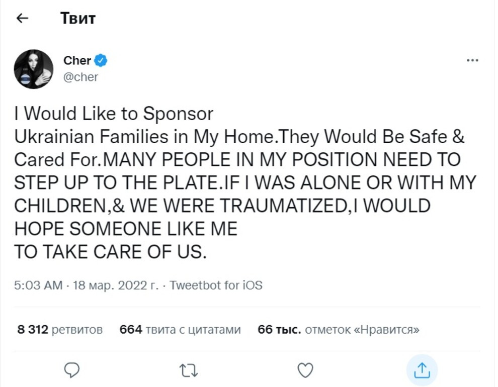 "Я хотіла би стати спонсором українських сімей у своєму домі. Забезпечила б їм безпеку та піклування", – йдеться в твіті співачки, яка вже не вперше підтримує Україну. Шер вважає, що привілейовані та забезпечені люди мають вчиняти так само в ці часи та брати відповідальність на себе. "Якщо ми з дітьми постраждали б так само, я б мала надію, що хтось потурбується про нас", – додала співачка.