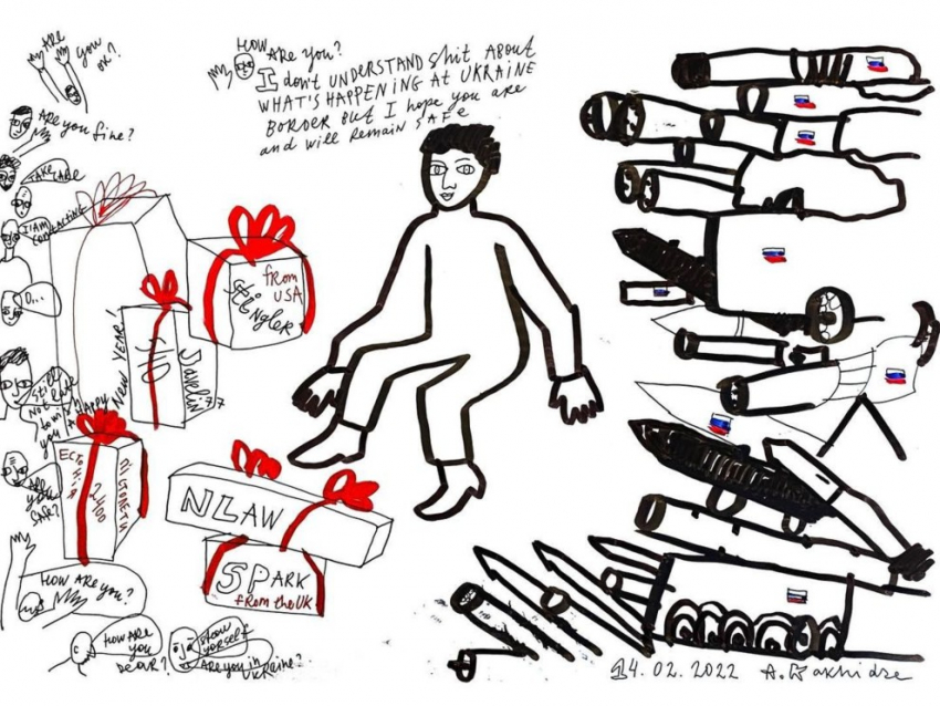 Автор – Алевтина Кахідзе (Фото – @artists.support.ukraine)"Перші три дні проєкт робився правою рукою та голосовими повідомленнями, поки лівою я вела машину на Захід. Нині я в Ужгороді в порівняній безпеці. За ці 10 днів різної роботи й допомоги я зрозуміла, що треба й далі робити те, що робиш найкраще. Я розумію, що можу бути ефективнішою у своєму професійному полі. І тому зосередила всі сили на тому, щоб поширити якомога більше інформації про війну, про те, що відбувається в Україні, і достукатися до найдальших куточків планети. У проєкті представлено 38 робіт українських художників та ілюстраторів. За кожною з них чиєсь життя. Життя, яке може бути в небезпеці просто зараз. Міжнародні інституції й художники щодня долучаються до проєкту. Ми сподіваємося, що голос України почують, а війну буде припинено якнайшвидше спільними зусиллями".