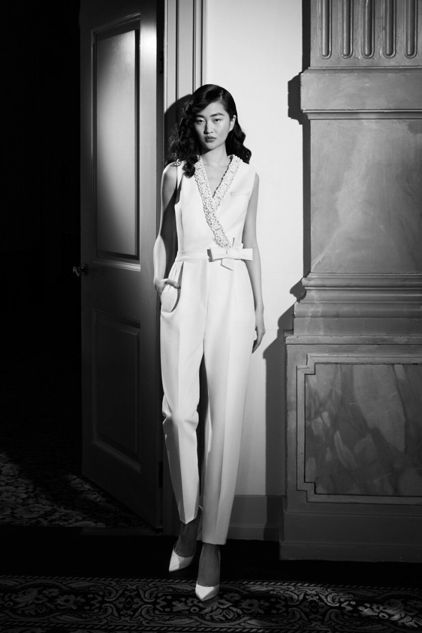 AmsaleО невестах, которые предпочитают свадебным платьям брючные костюмы или комбинезоны, дизайнеры также позаботились в новом сезоне. Например, Kaviar Gauche предложили атласный комбинезон в длине мини с большим бантом на груди и съемной юбкой в пол, а Viktor & Rolf украсили элегантный образ аккуратным и утонченным декором на талии.