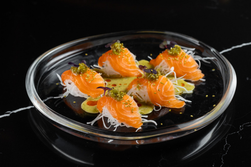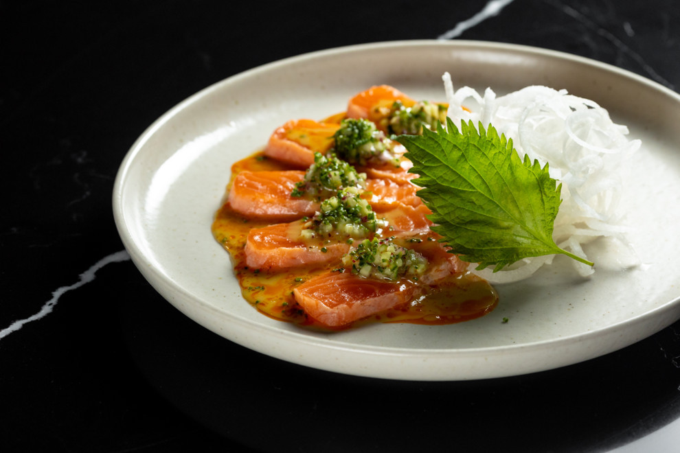 Познакомиться с новыми текстурами и вкусами паназиатской кухни получится благодаря таким позициям, как татаки лосось с горчичным соусом с сальсой из халапеньо и огурца, где шеф объединил японские и мексиканские традиции.