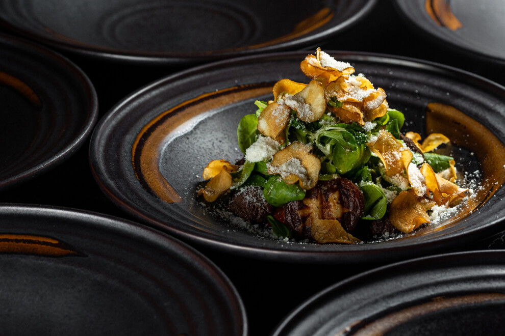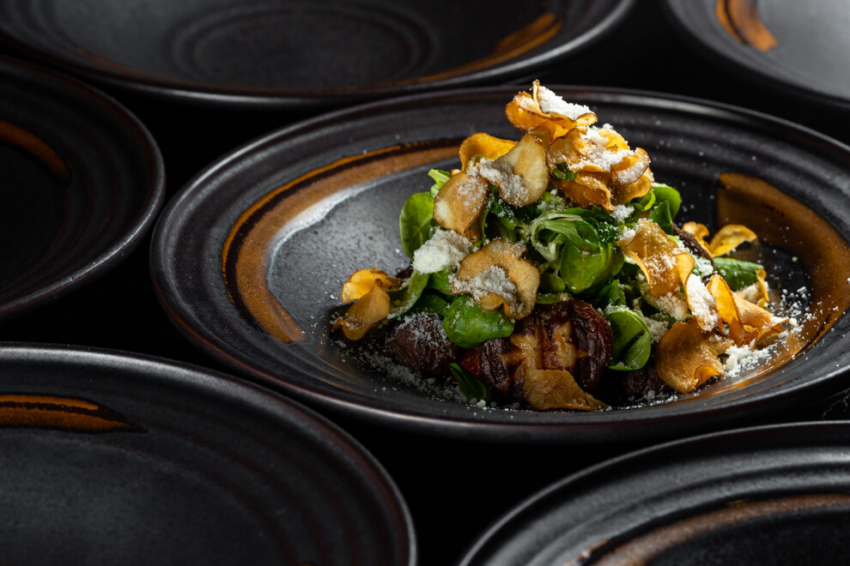 Ролл со спайси тунцом, авокадо и луковым майонезомТеплый салат с телятиной USDA Prime, грибами шиитаке, печеным томатом и топинамбуром фри – пример сочетания элитного продукта со знакомыми всем ингредиентами.