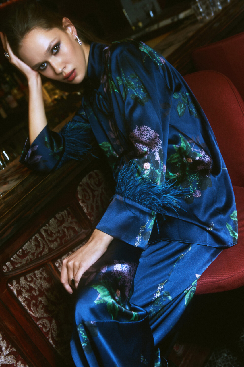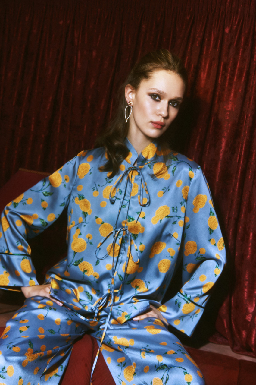 В лимитированную коллекцию вошли девять знаковых принтов бренда. Среди них — курочки Петра Марковича, орнаменты девушек-купальщиц, цветки бархатца и гроздья ежевики, воины-самураи и, конечно же, иконические для Lake Studio артишоки. Пижамы скроены в восточной эстетике — с воротником-стойкой и на завязках вместо пуговиц.