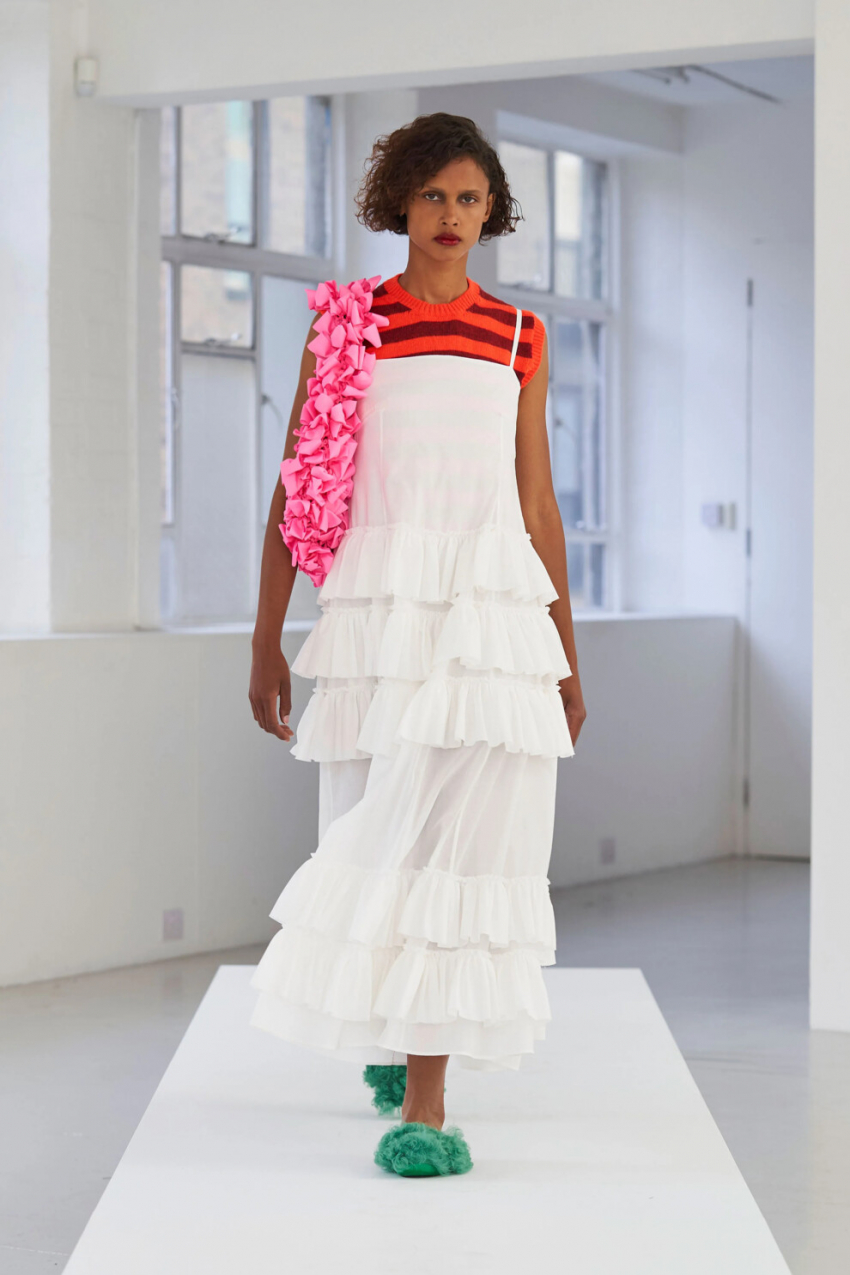 Объемные хлопковые платья точно стоит оставить в своих осенних гардеробах. За вдохновением советуем обратиться к показу коллекции весна-лето 2021 Molly Goddard: дизайнер соединила базовые белые фасоны с полосатыми жилетами и пушистой обувью из своей коллаборации с Ugg.