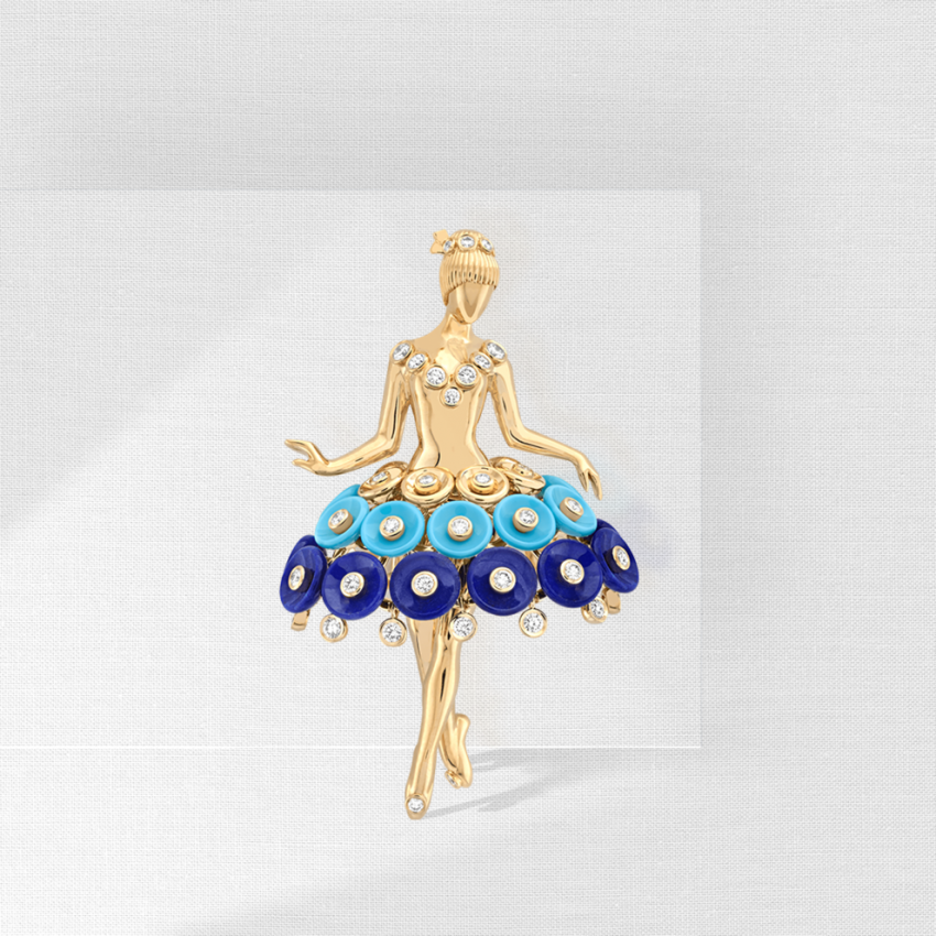 Коллекция Bouton d’or, вдохновленная наследием Дома, также пополнилась новым изделием - это первая брошь с фигуркой балерины, выполненная в современном стиле. В работе над ней ювелиры Дома стремились добиться совершенства исполнения в лучших традициях Высокого ювелирного и часового искусства Van Cleef & Arpels. Яркую объемную юбку, каждая из которых выполнена вручную, украшают декоративные пайетки. Сочетание желтого золота, бирюзы и лазурита формирует красивый рельеф, дополненный сиянием бриллиантов, которыми усыпаны костюм и прическа балерины.