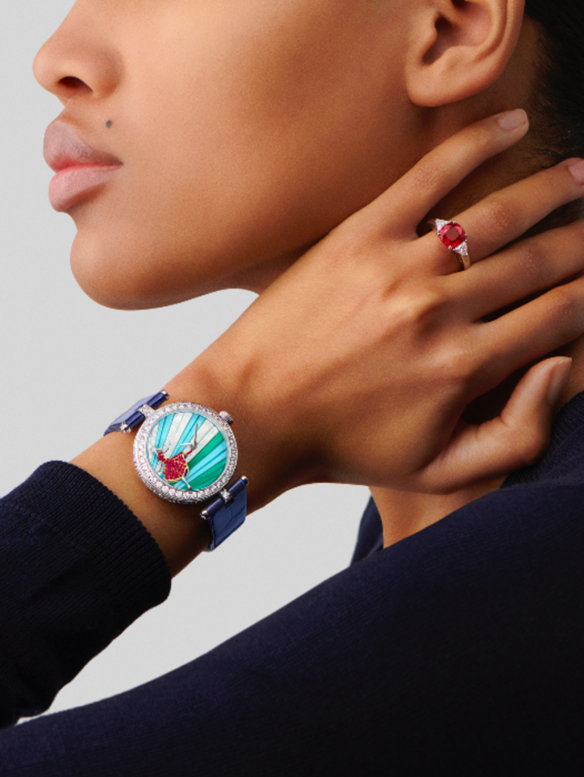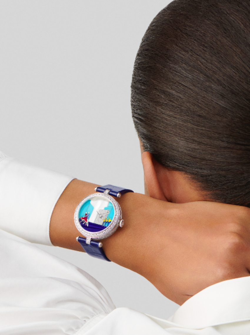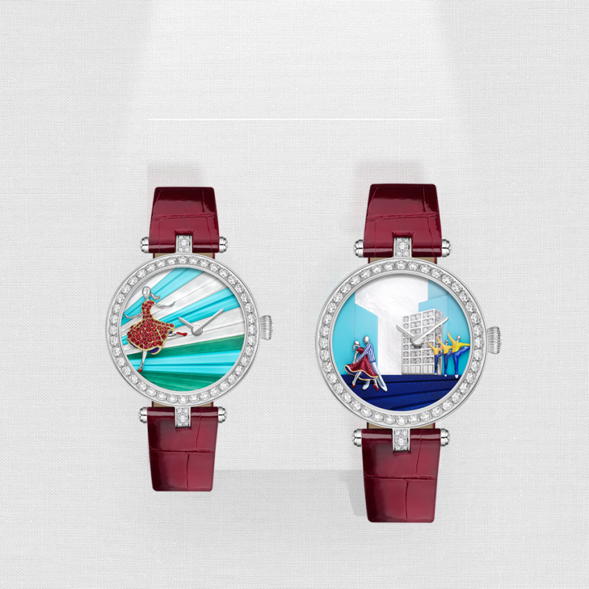 Помимо брошей, мир танца нашел отражение на циферблатах двух моделей часов коллекции Extraordinary Dials: Lady Danse и Lady Danse Duo. Часы выполнены в корпусе 33 мм и посвящены двум самым главным моментам в жизни артиста: выходу на сцену и выступлению. Благодаря своему большому опыту эксперты Дома Van Cleef & Arpels умело выбирают только те драгоценные и поделочные камни, которые соответствуют строгим критериям бренда. Геммологи обращают особое внимание на однородность цвета бирюзы, лазурита и хризопраза, а также на гладкость поверхности и приятное сияние перламутра. Среди бриллиантов, которыми декорируют циферблаты или корпус часов, отбираются только камни с цветом D, E или F и чистотой IF или VVS. В сочетании с белым золотом они придают украшениям особое сияние.