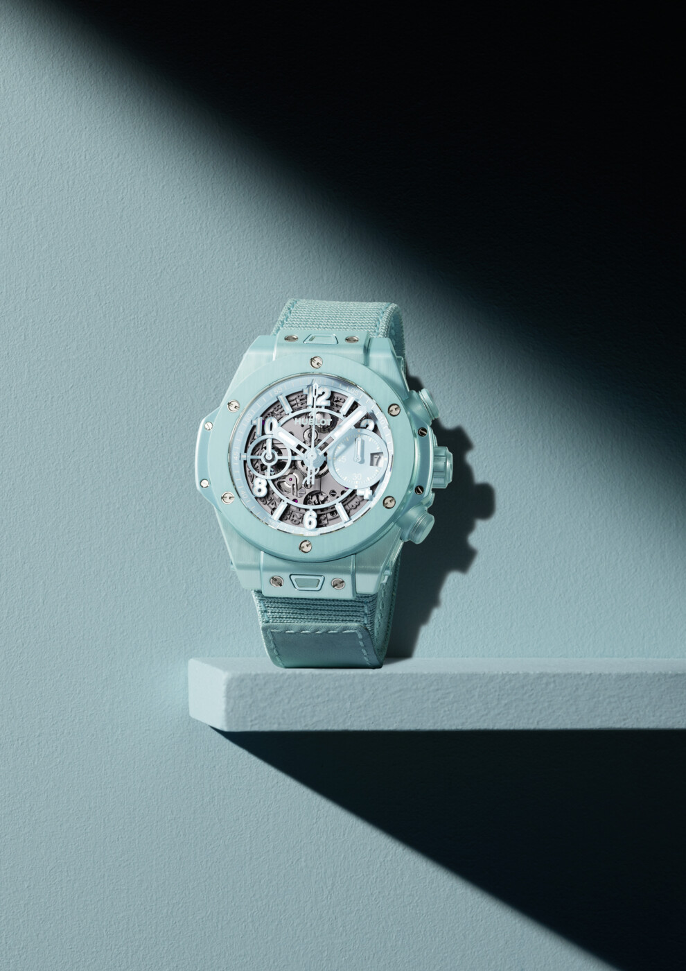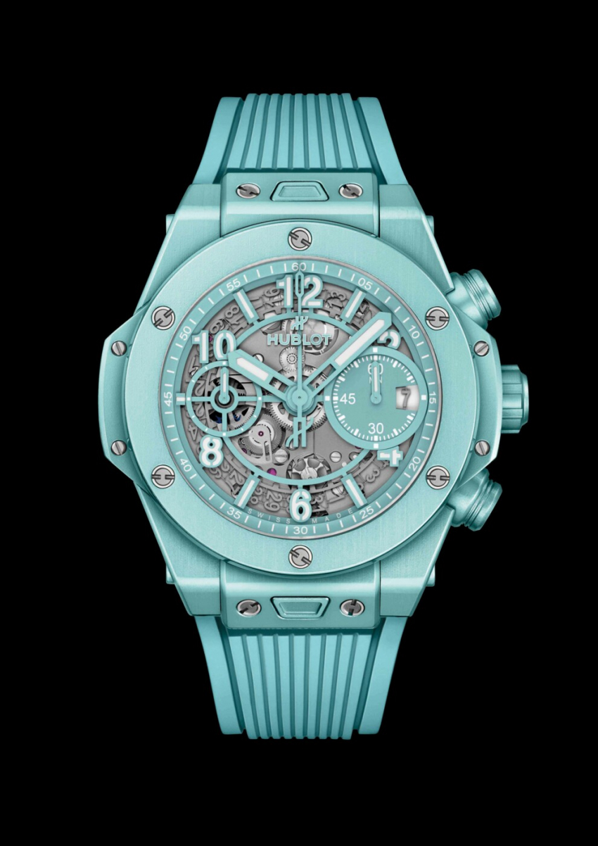 Швейцарский бренд Hublot представил новую модель Big Bang Unico Summer: корпус часов изготовлен из сатинированного анодированного алюминия – современного легкого материала, который окрашен в мягкий бирюзовый цвет. Модель выпущена в количестве 200 экземпляров.