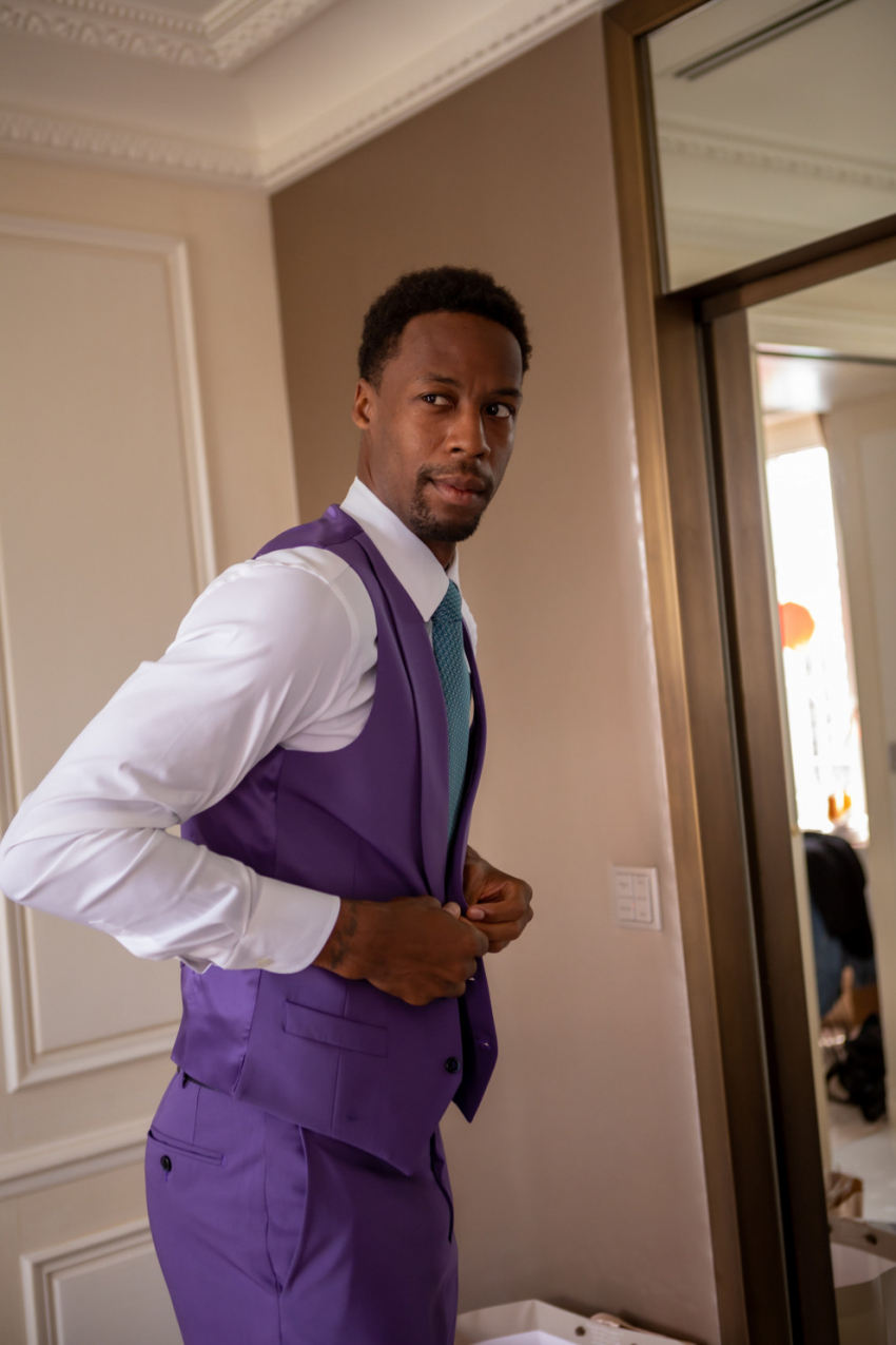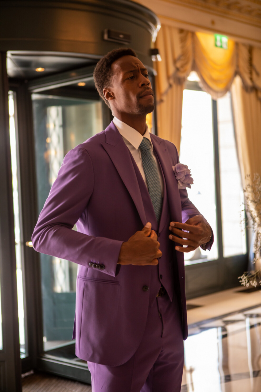 Элина СвитолинаОб образе Гаэля МонфисаУ Гаэля как и у меня было два образа. Днем он выбрал фиолетовый костюм, причем на момент покупки он не знал, что и мое платье будет в этой же цветовой гамме. Второй образ – более классический в черно-белом цвете. Оба наряда для него подготовили в миланском ателье бренда мужской одежды Boggi.