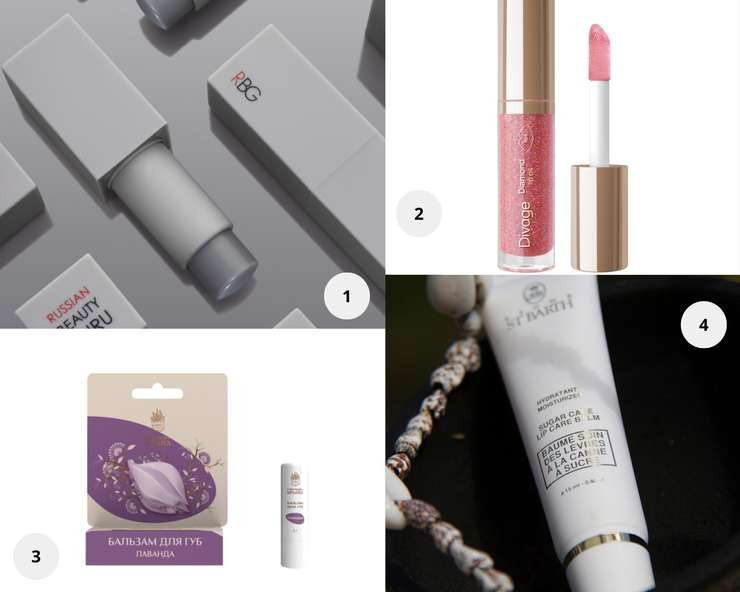 1. Городской серый бальзам для губ, RBG. 2. Масло для губ сияющее Diamond Lip Oil Divage. 3. Сокровища Крыма, Бальзам для губ Лаванда. 4. Бальзам для губ с экстрактом сахарного тростника, LIGNE ST BARTH.