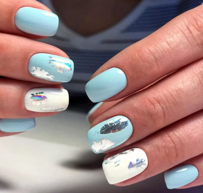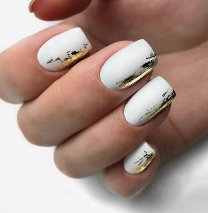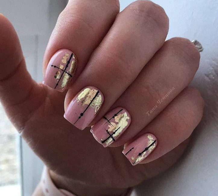 - Использование золотой или серебряной фольги, которая наносится на ногтевую пластину отдельными элементами, за счет чего позволяет имитировать старую патину. В этом случае базовый фон должен быть либо максимально светлым, либо, как противовес, темным.