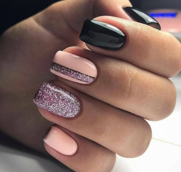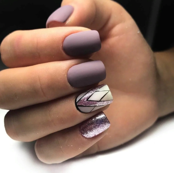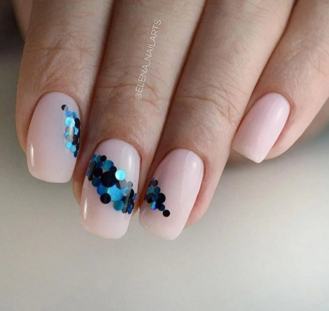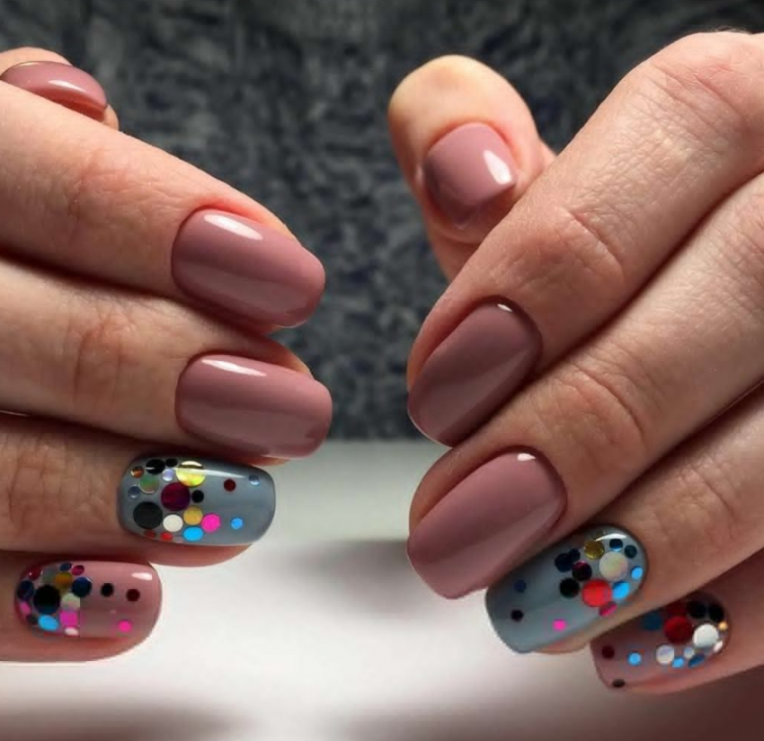 - Матовый нейтральный лак, нанесенный по всем ногтевым пластинам, дополненный блестками. Но блестящие элементы должны быть точечными, чтобы они только оттеняли основной фон.
