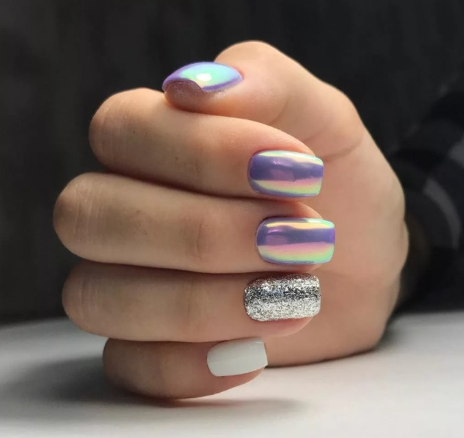 - Еще один стильный вариант маникюра достигается при использовании разных втирок. С помощью такой пудры можно добиться самых интересных эффектов на ногтевой пластине – от идеального металлического блеска разного оттенка до радужных переливов или жемчужного сияния.