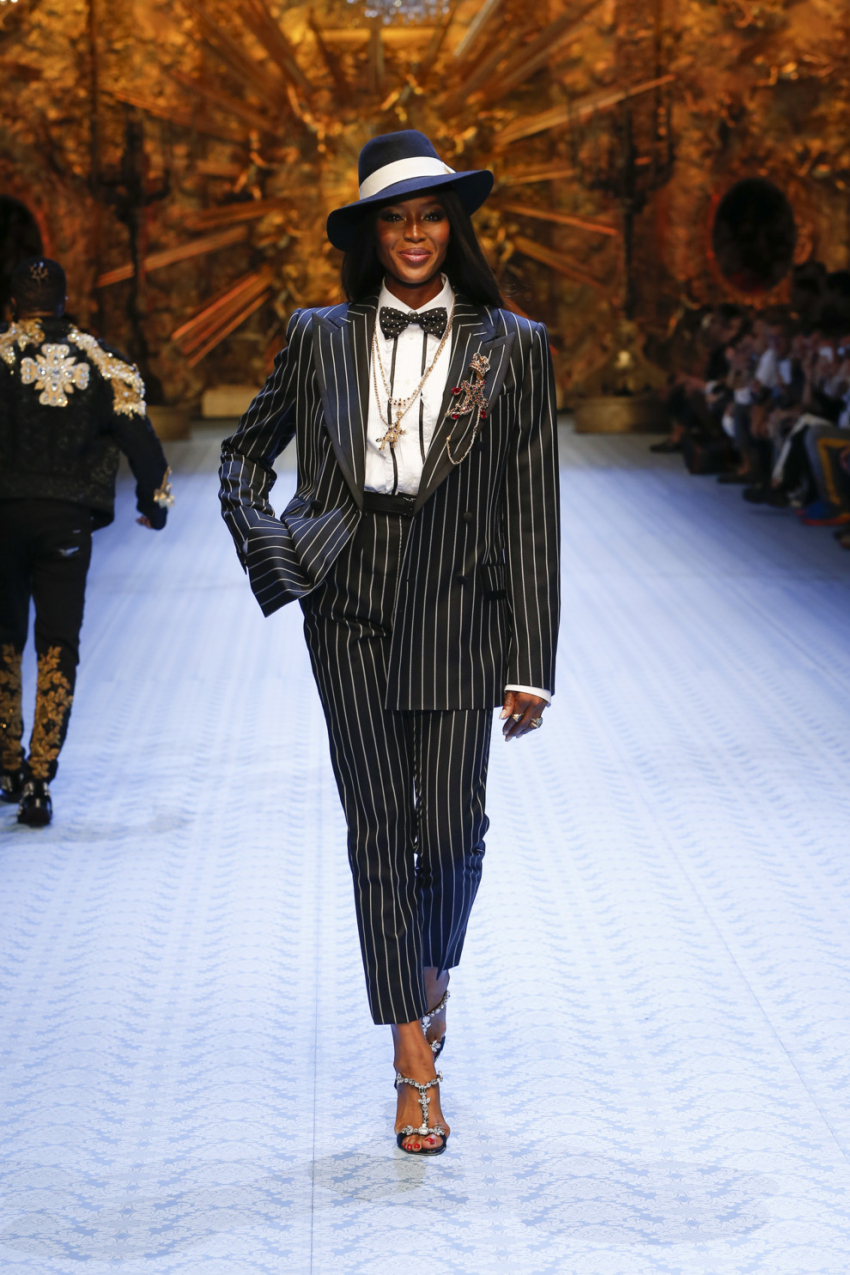 Saint Laurent весна-лето 2020Dolce & Gabbana Menswear весна-лето 2019"Наоми Кэмпбелл – дорогой наш друг, которую мы очень давно знаем. Она всегда в наших сердцах и мы счастливы разделять с ней радостные моменты жизни. У Наоми заразительная улыбка, она действительно очень щедрый и особенный человек – вместе мы разрабатывали дизайн футболки для благотворительного проекта Fashion For Relief. К тому же она величайшая супермодель, она полна жизни и энергии, она чувственная и настоящая – истинное воплощение женщины Dolce & Gabbana для нас. Работать с ней – это всегда уникальный опыт", – Доменико Дольче и Стефано Габбана.