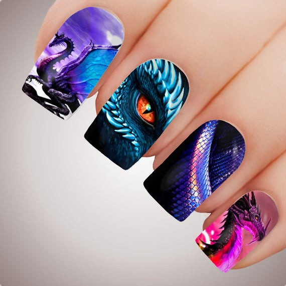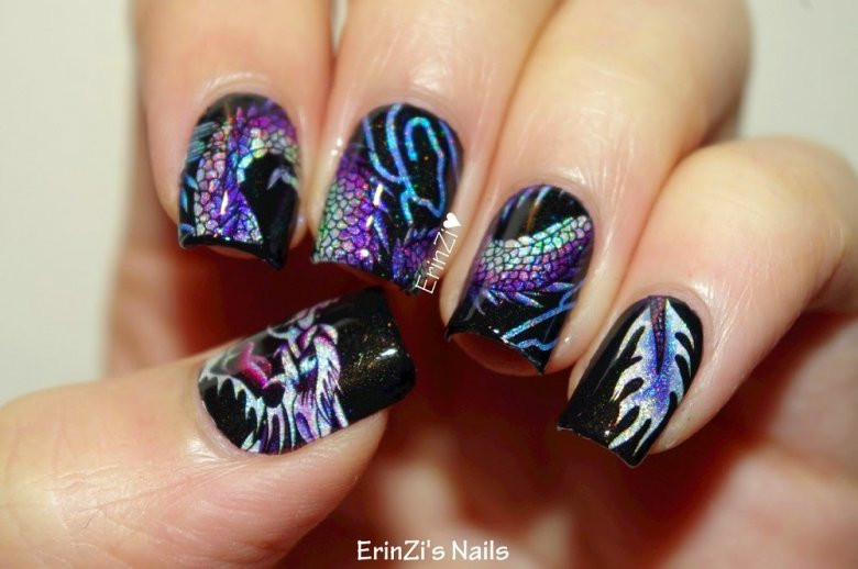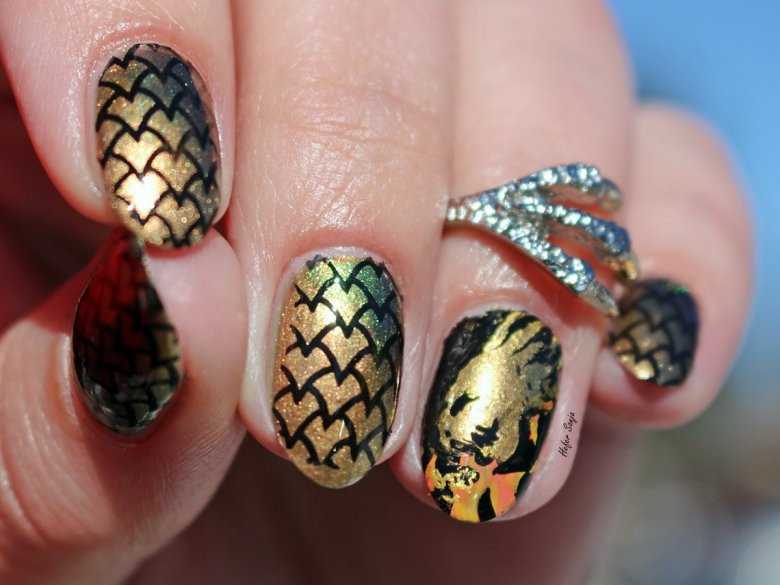 Оригинальным новогодним дизайном будет изображение дракона на ногтях. Поскольку по многим легендам драконы были хранителями золота и драгоценных камней, то уместным будет использование золотого и серебряного цветов, а также страз, имитирующих алмазы, сапфиры и пр.