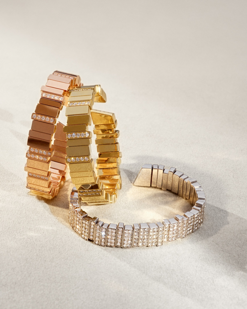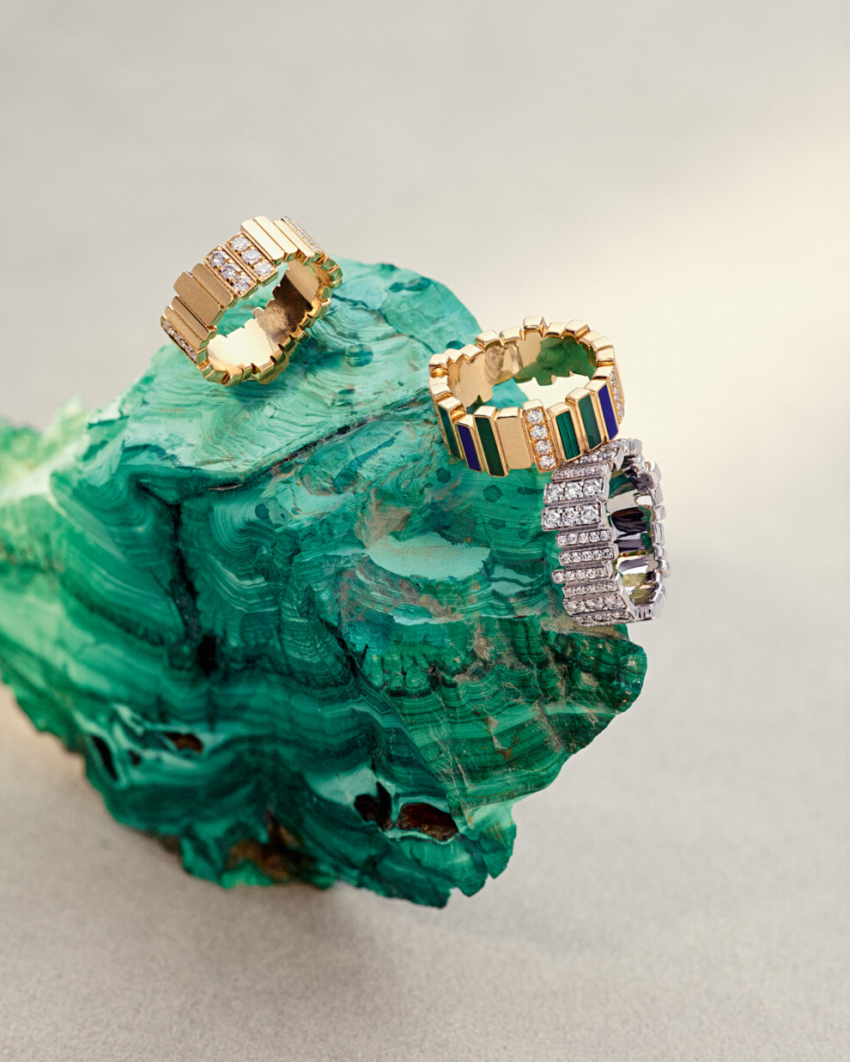 Браслет Gem Dior, розовое золото, бриллианты, браслет Gem Dior, желтое золото, бриллианты, браслет Gem Dior, белое золото, бриллианты, все – DiorИ вот теперь Gem, где браслеты составлены из прямоугольников, напоминающих рояльные клавиши. Правда, вместо черного и белого – разнообразнейшие естественные цвета минералов. «Для меня цвет очень важен, и я люблю использовать все камни сразу. Я смешала малахит, лазурит, перламутр и сердолик. Есть розовый опал, есть тигровый глаз. Собирая их вместе, я пыталась сыграть на многоцветье, но, конечно, учитывала нюансы оттенков. Некоторые браслеты целиком состоят из расположенных в шахматном порядке декоративных камней. Все стороны асимметричны, как и в природе».