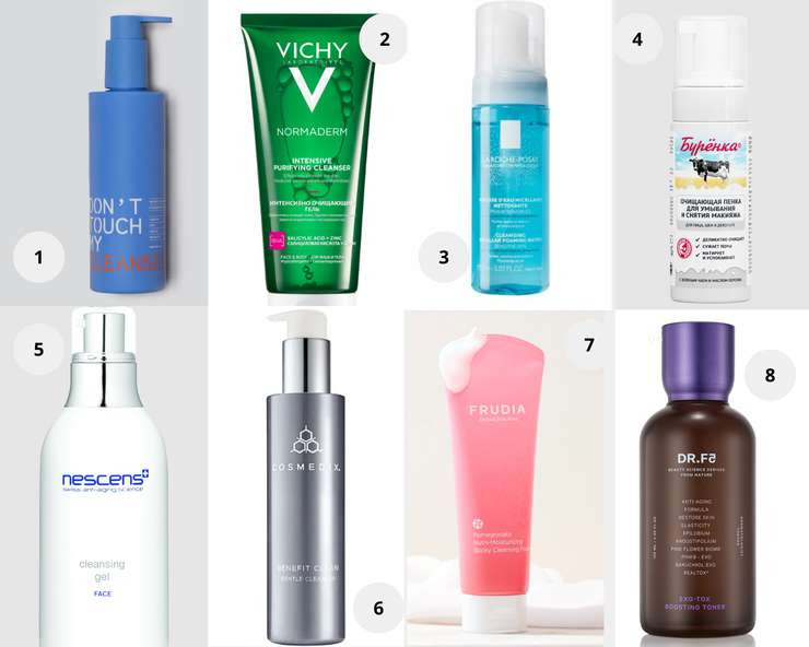 1. Гель для умывания Don’t Touch My Skin. 2. Vichy Реновация Интенсивно очищающий гель Normaderm. 3. La Roche-Posay Мицеллярная очищающая пенка. 4. Буренка Очищающая пенка для умывания и снятия макияжа с Зеленым чаем и маслом Персика. 5. Гель для умывания Cleansing gel face, Nescens. 6. Нежный очищающий гель для умывания с экстрактом амаранта Benefit Clean, COSMEDIX. 7. FRUDIA пенка-суфле для умывания с гранатом. 8. DR.F5 уплотняющий тонер с бакучиолом.
