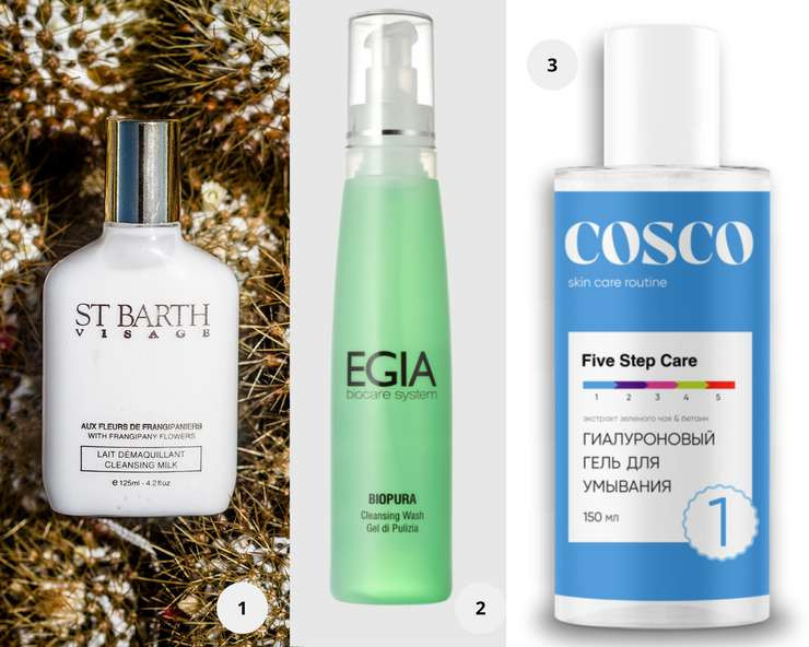 1. Cleansing Milk With Frangipani Flowers/Очищающее молочко с экстрактом лепестков франжипани, LIGNE ST BARTH. 2. Гиалуроновый гель для умывания Cosco. 3. Гель очищающий / Cleansing Wash, EGIA Biocare System.