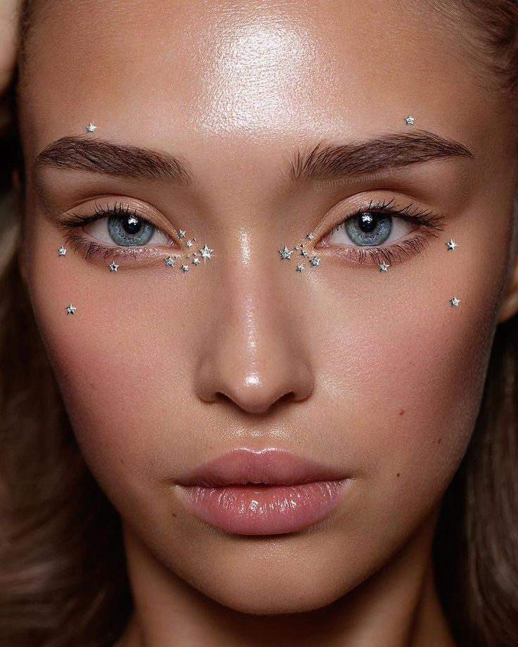 - Экстравагантным дамам придутся по вкусу переливающиеся пайетки и стразы. Их можно наносить не только на веки, но и на щеки и область губ.