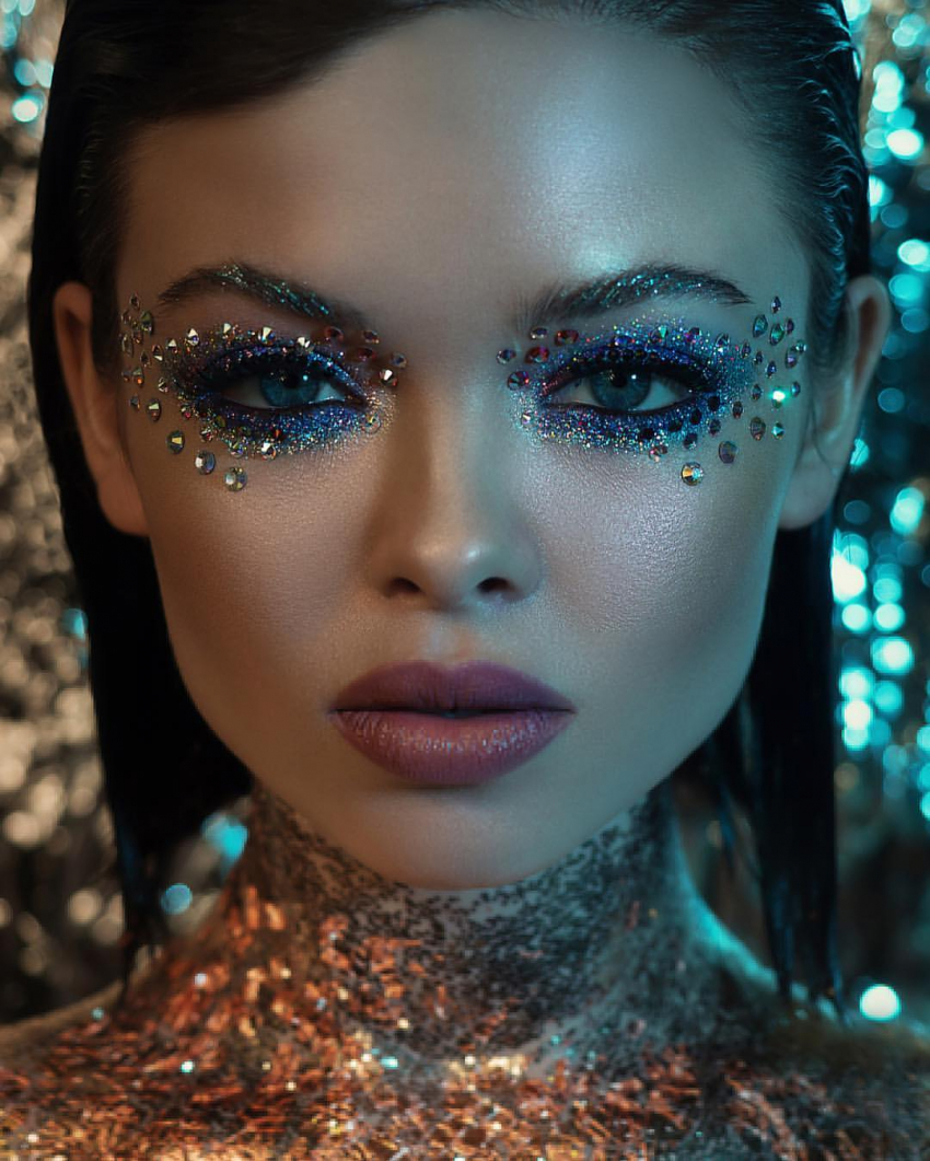 Для модниц, которые любят выделяться в толпе, в грядущем году модные визажисты предлагают тематический мейкап, который выглядит очень необычно, смело и интригующе. Голографические стразы, россыпь переливающихся блесток, различные капельки, пайетки и снежинки помогут создать самые смелые и необычные образы.
