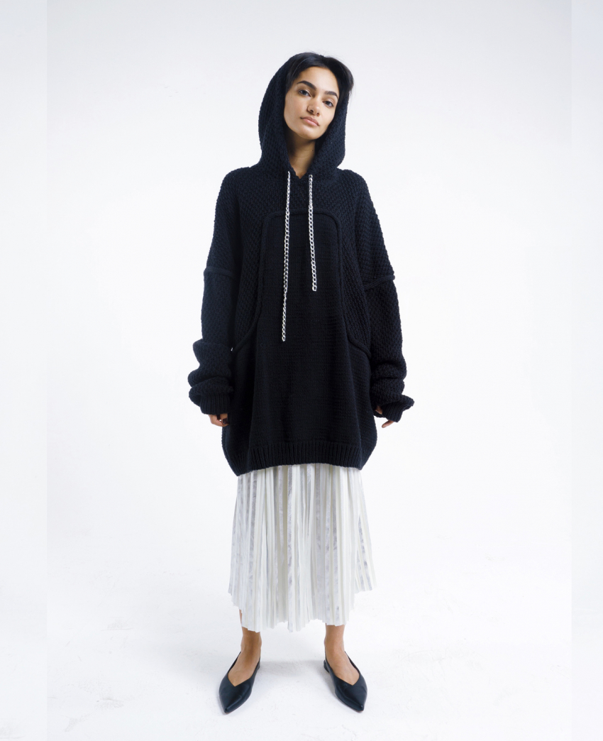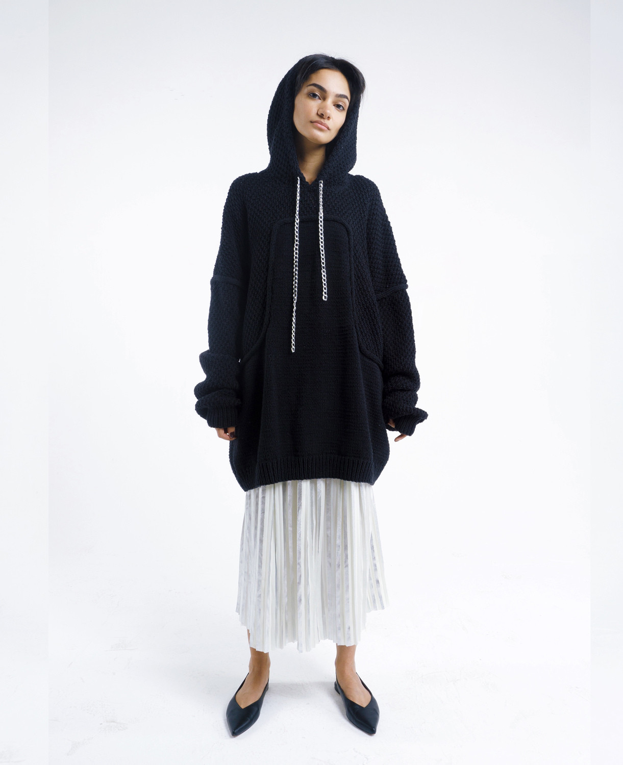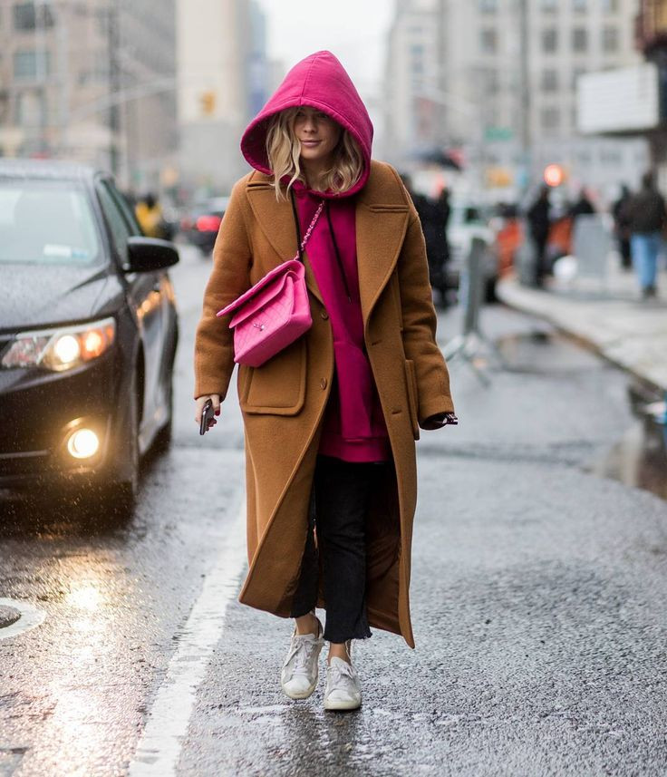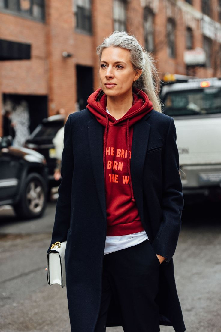 Этот же тезис можно отнести к комбинаторике толстовки с верхней одеждой. Конечно, более естественно бомбер, худи, свитшот смотрятся с куртками различных фасонов, пальто оверсайз размера, но все чаще на подиуме можно увидеть капюшон толстовки, выглядывающий из ворота мехового пальто, плаща, пиджака строго кроя. В подобном сочетании даже есть определенный шарм. К тому же толстовки с капюшонами — достаточно удобная вещь, если этой детали нет на пальто, куртке.