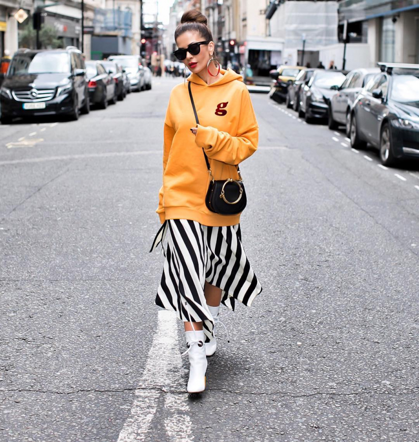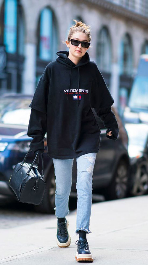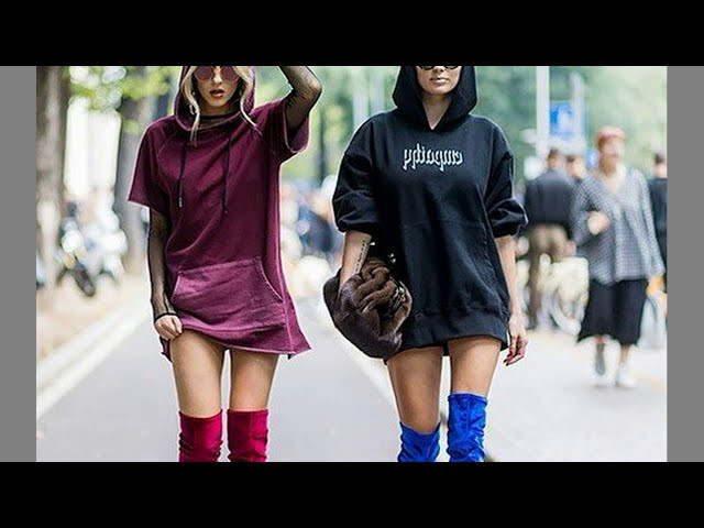 Ранее толстовку привязывали к обуви без каблука, спортивного формата. В современной модной трактовке этот тезис уже не актуален. Толстовки носят с обувью на каблуке, сапогами различных моделей. В такой подаче толстовка смотрится стильно и органично.