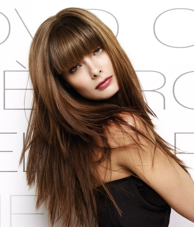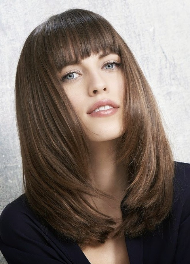 - Густую прямую челку. Именно такой вариант сможет сделать лук контрастным – многослойная и ступенчатая стрижка будет «соперничать» с ровной прямой челкой. Длину можно выбрать абсолютно любую. Как правило, подобный вариант выбирают строгие леди, имеющие консервативный характер.