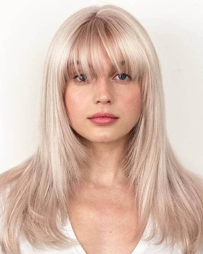 Лесенка одинаково хорошо выглядит и с челкой, и без нее. Одной из самых популярных стрижек сезона 2022 стала средняя лесенка с массивной густой челкой, пряди которой касаются скул.