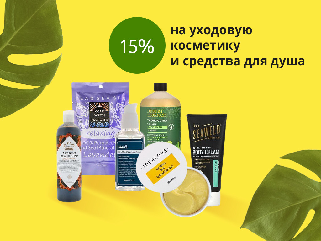В категории «Средства для душа и ухода за собой» скидка действует на гели для душа, мыло для рук, лица и тела, шампуни и кондиционеры, соли и бомбочки для ванны, дезодоранты, зубные пасты, ополаскиватели для полости рта, очищающие салфетки, восстанавливающие и защитные кремы и бальзамы. В этих категориях среди самых любимых товаров африканское черное мыло Nubian Heritage, зубная гель-паста с мятой Now Foods XyliWhite, а также масло сладкого миндаля для тела после душа Now Foods.