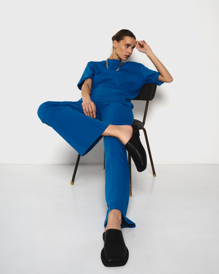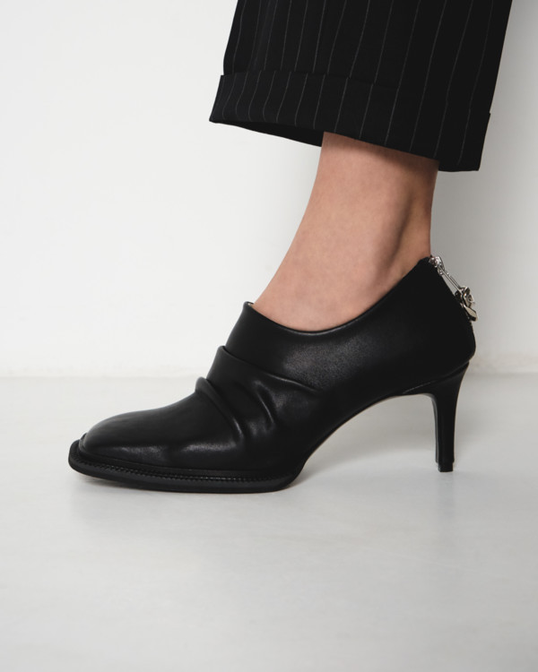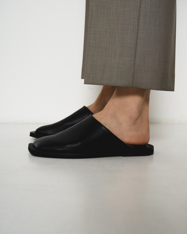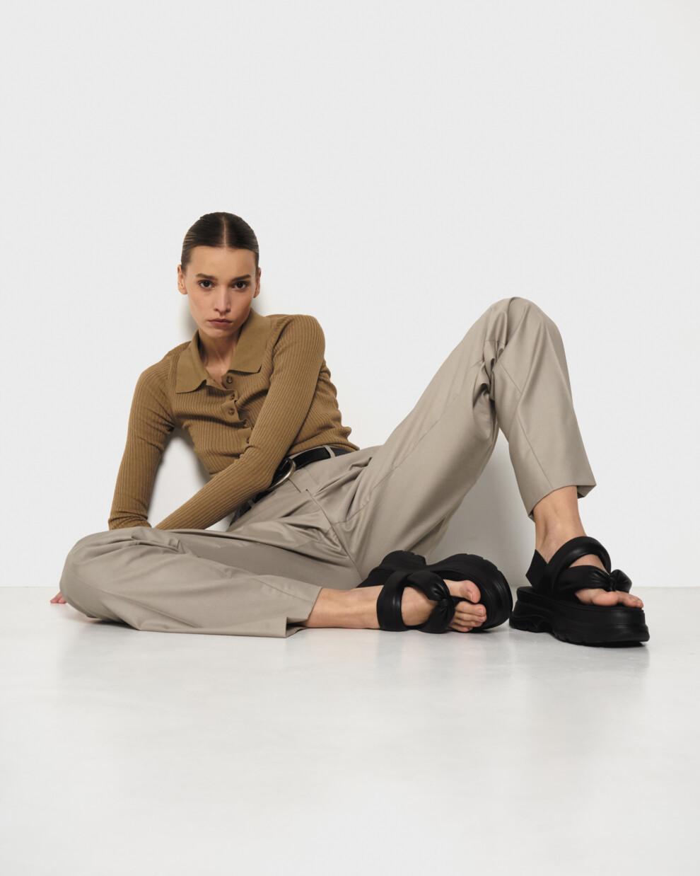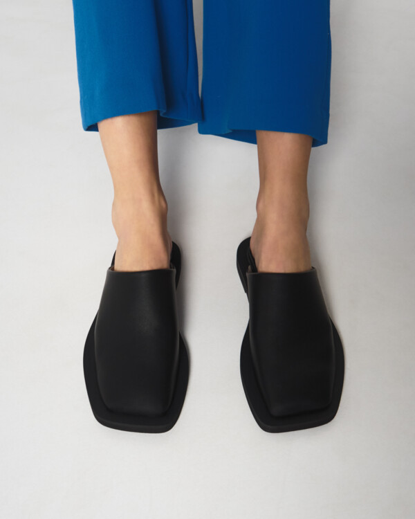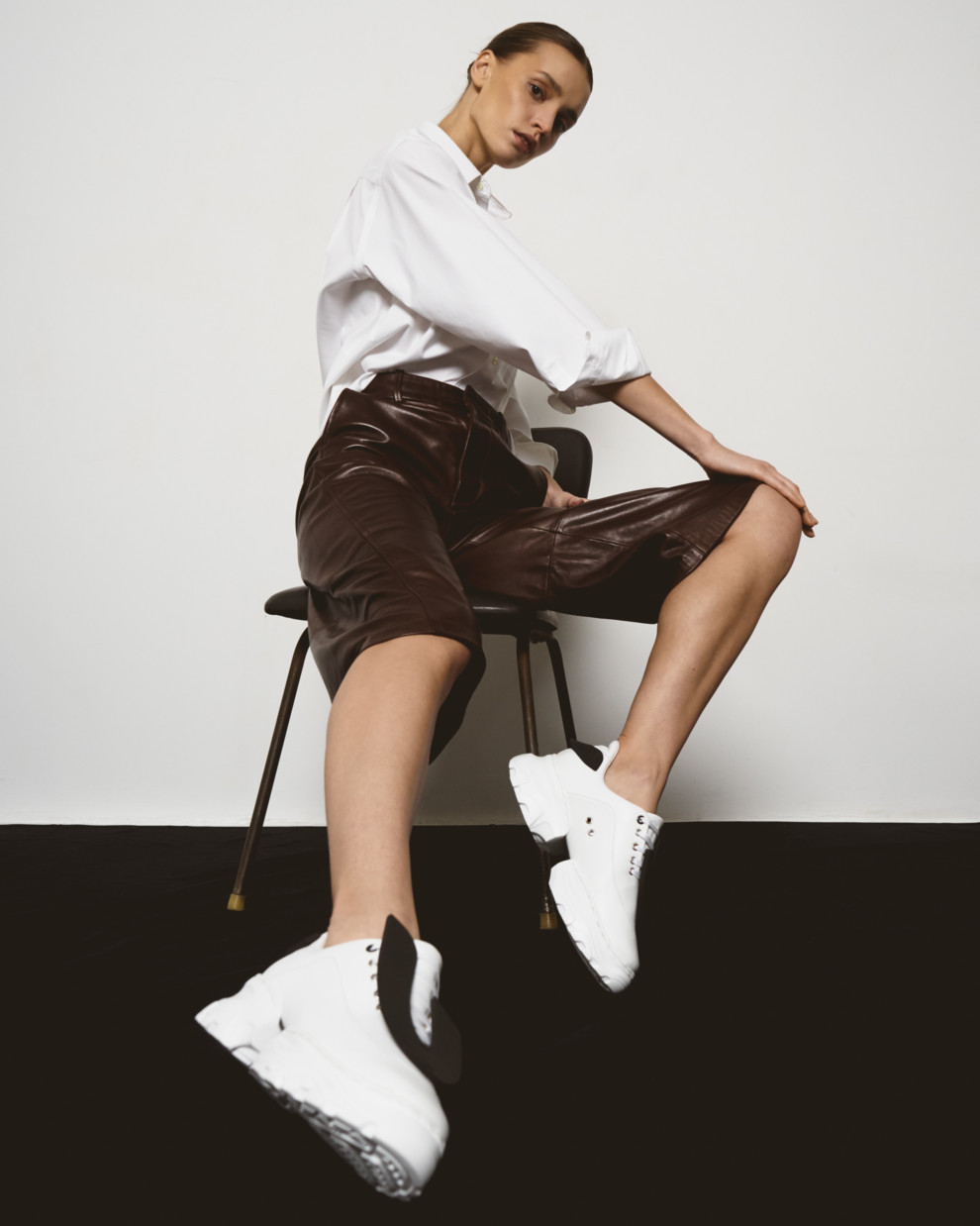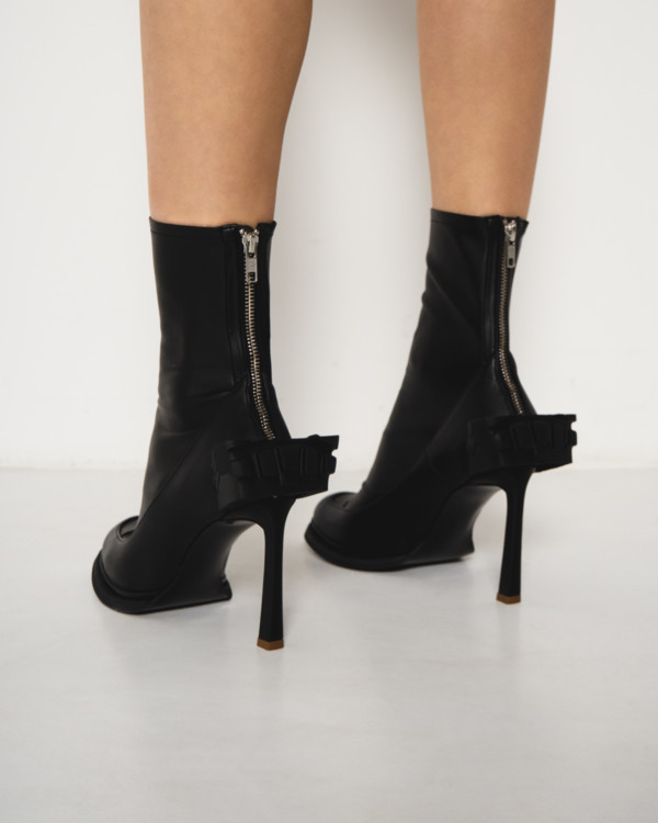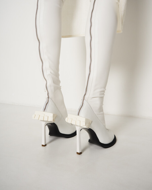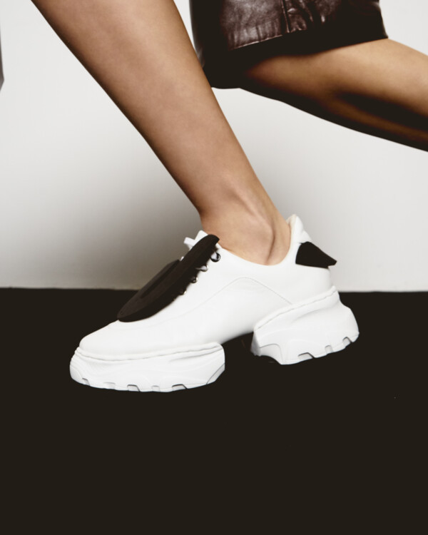 Этот характер интерпретирован и в самом дизайне. Привычные массивные каблуки сменила шпилька и kitten heel, которые особенно акцентированно выглядят совместно с геометрическим носком и прямоугольными эллементами в пяточной части. Помимо сапог-чулок и ботильон в коллекцию вошли минималистические туфли и мюли, а также кроссовки и сандалии-вьетнамки на массивной платформе. Дополнением стали украшения из ювелирного сплава: браслеты и колье, которые поддерживают общую концепцию.