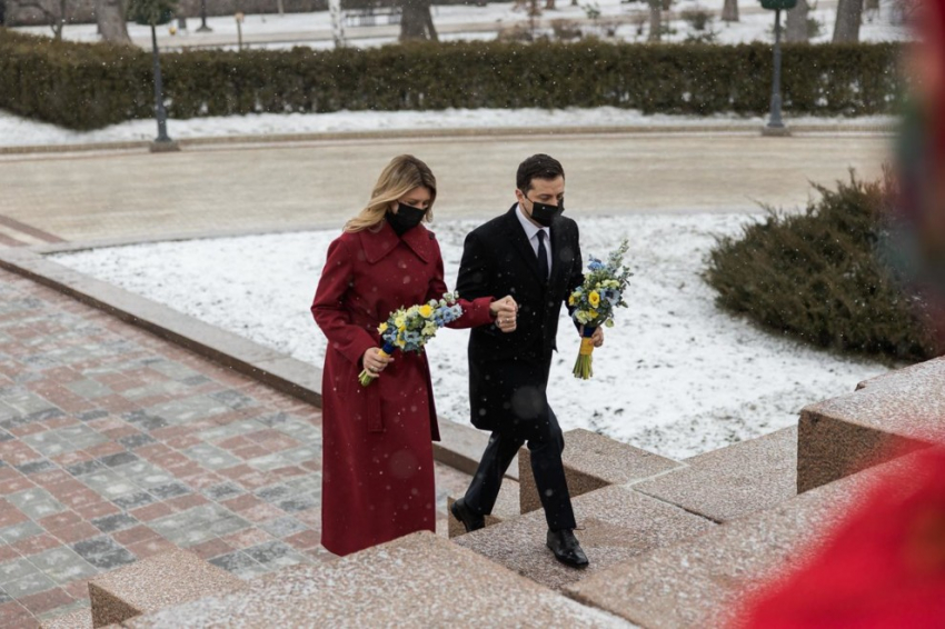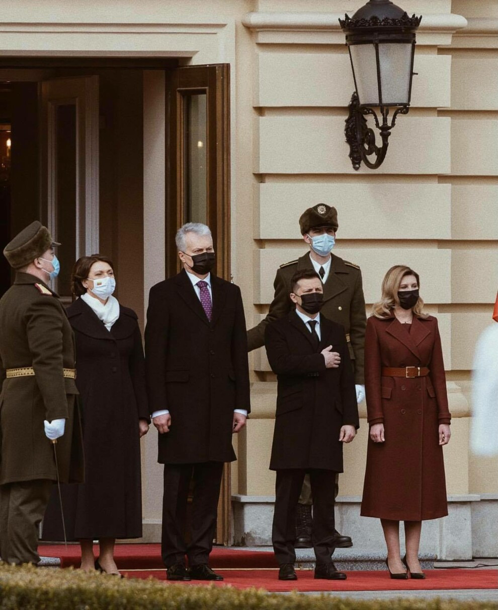 18 марта первая леди Украины Елена Зеленская приняла участие в торжественной встрече с президентом Литвы Гитанасом Науседа и его женой Дианой, которые прибыли в Киев с двухдневным официальным визитом. Состоялось мероприятие в Мариинском дворце, церемониальной резиденции Украины. Для столь ответственного повода Елена Зеленская выбрала образ украинского бренда A.M.G.