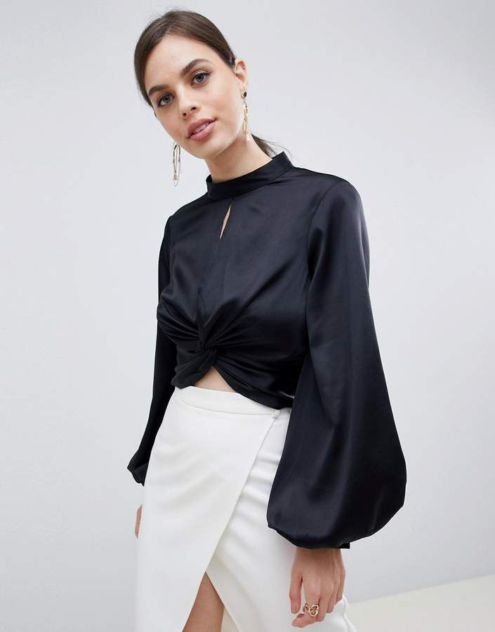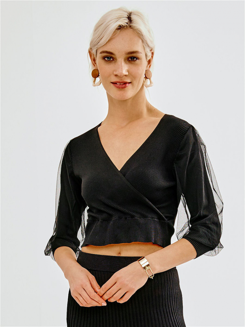Еще один тренд 2022 года — модные укороченные блузки. Среди новинок большой популярностью пользуются изделия с широким поясом и глубоким декольте. Если такая одежда слишком открытая, то можно подобрать фасон с завязками на животе. Объемный бант поможет скрыть недостатки фигуры.