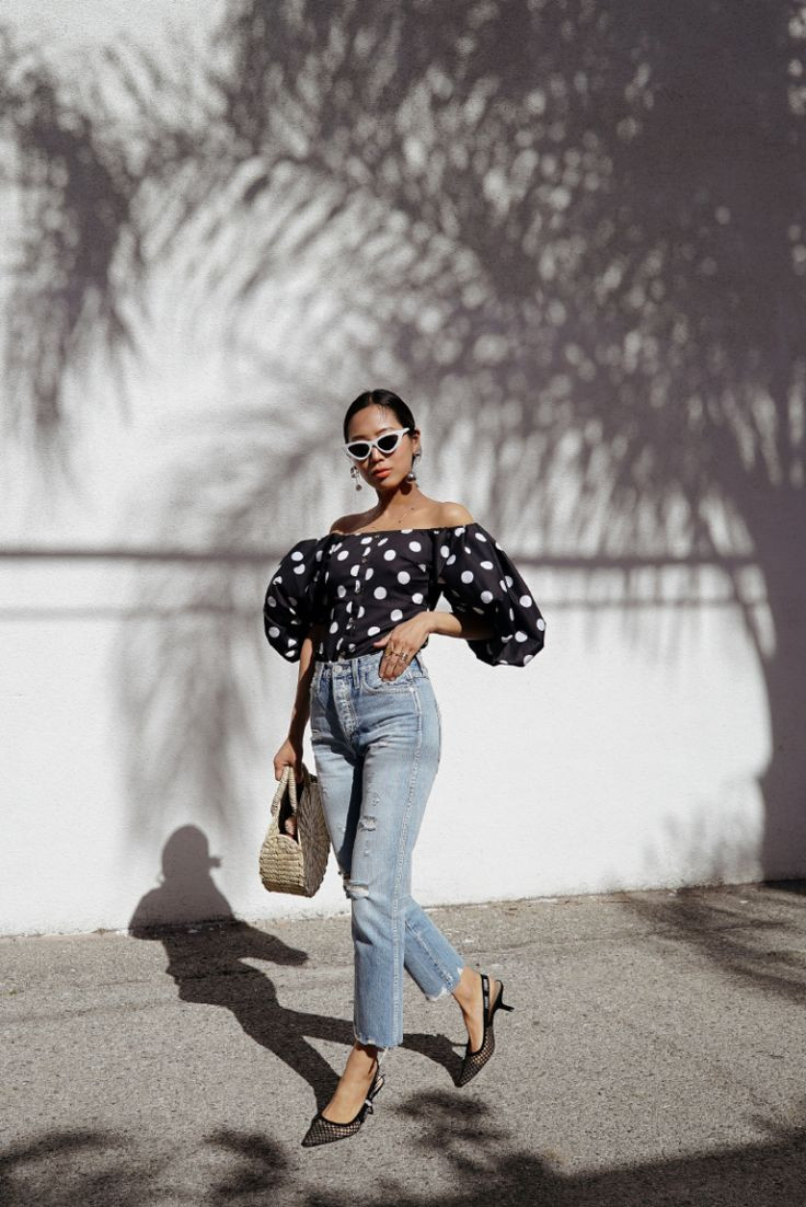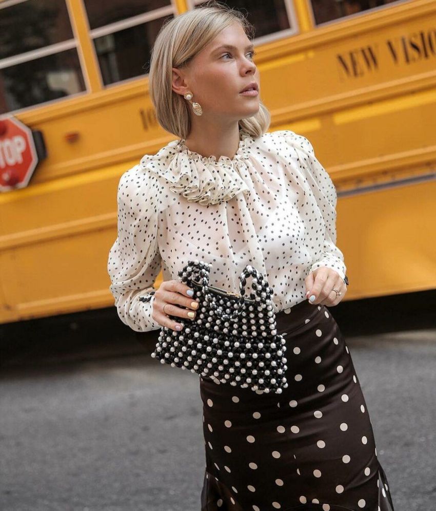 Еще один модный принт, который постепенно возвращается из прошлого. В 2022 году блузки в горошек станут настоящим трендом сезона. Кружки могут быть как крупными, так и мелкими. С правильно подобранной юбкой блузка в горошек будет смотреться эффектно и в офисе, и в ночном клубе.