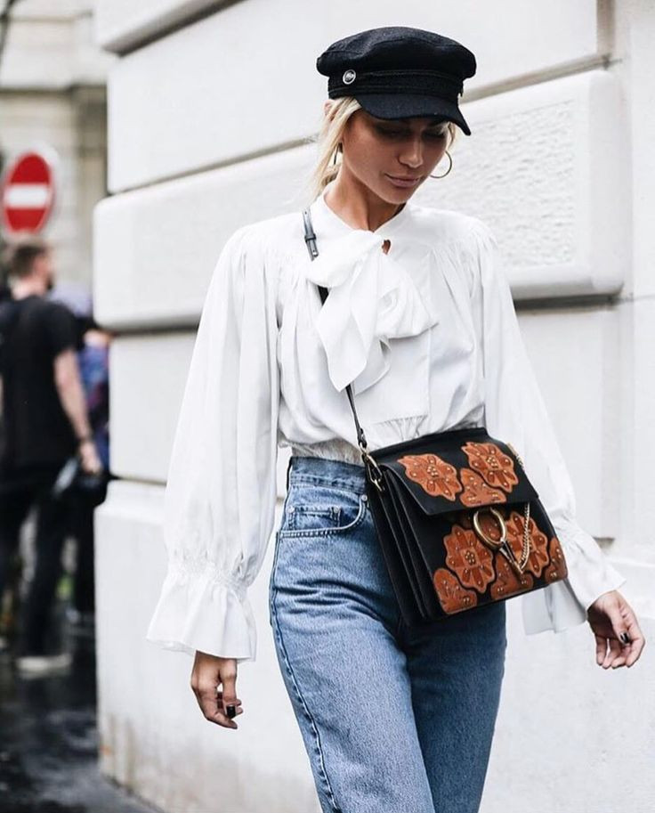 Характеристики такого фасона ничуть не изменились. В блузе с рукавами-фонариками женщина будет выглядеть привлекательно. Особенно если дополнить образ джинсами скинни, модными кедами и небольшой сумочкой.