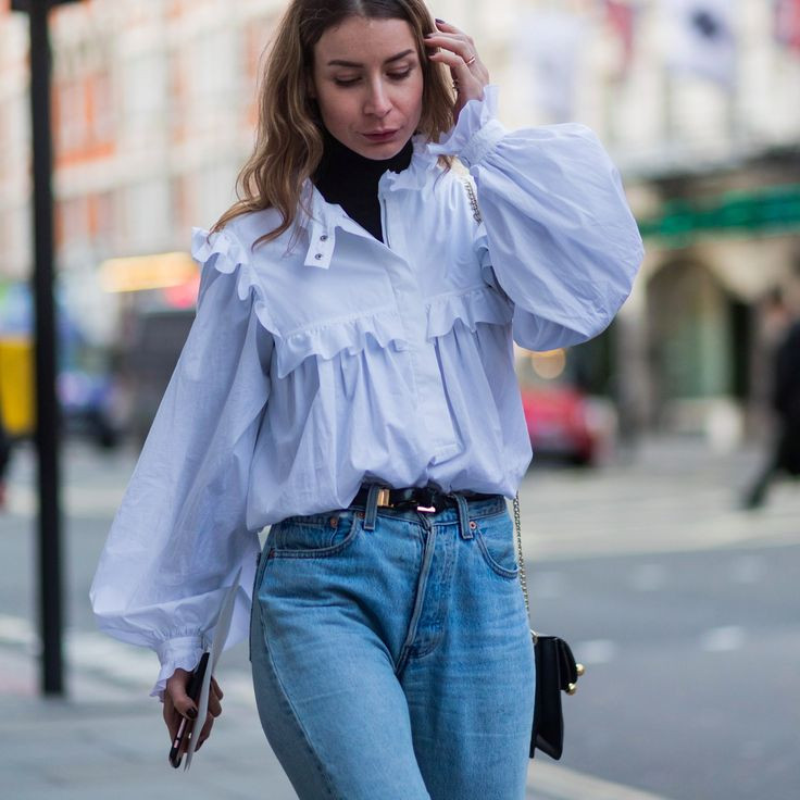 Сочетать блузки с рюшами и оборками следует только с узким простым низом. На юбке, брюках или джинсах не должно быть никаких деталей. Такой образ дополнит лаконичная обувь на высоком каблуке и клатч.