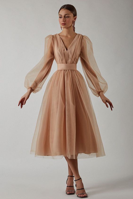 Кокеткам подойдут приталенные мини с пайетками, а романтичным личностям лучше присмотреться к моделям с полупрозрачными рукавами буф.