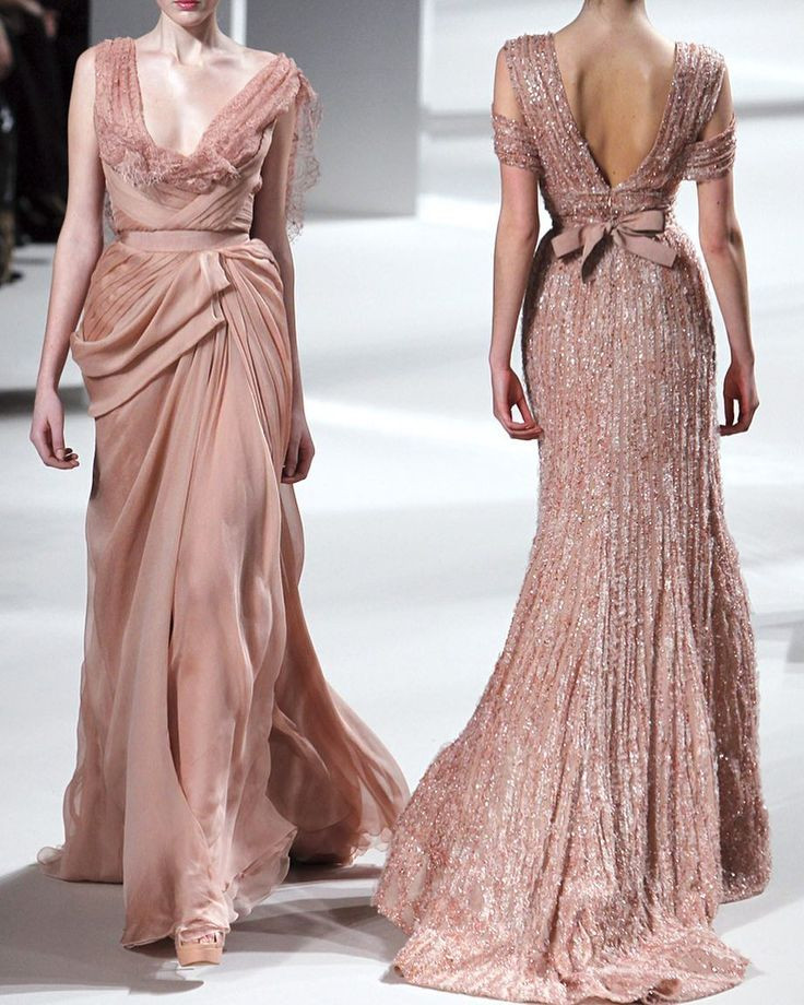 Стильным декором для вечерних платьев считается драпировка, она прекрасно сочетается с разной длиной. Наряды могут иметь разные особенности – асимметрию, пышные рукава, открытые декольте.