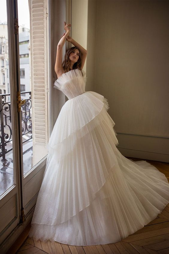 - Обладательницам фигуры «перевернутый треугольник» требуется соблюдение пропорций. Необходимы платья, обтягивающие верх. Юбки должны быть пышными, украшенными рюшами.