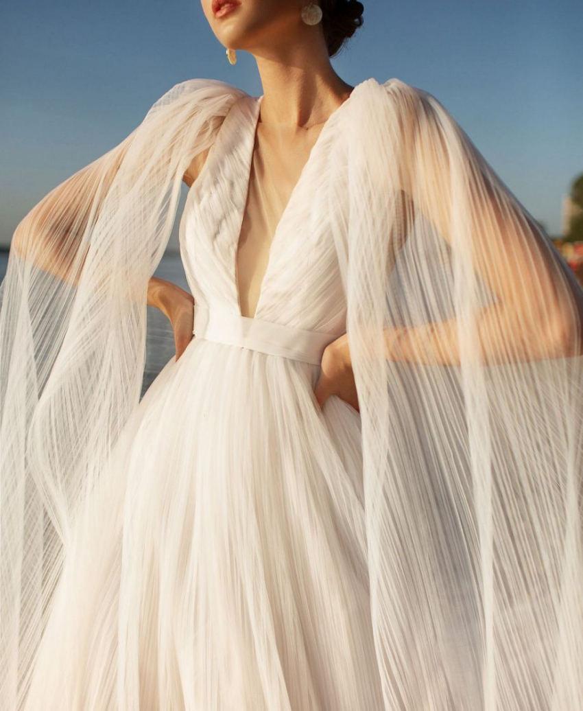 Худые руки можно скрыть с помощью длинных свободных рукавов. А сделать бюст визуально больше поможет лиф с рюшами, драпировкой.