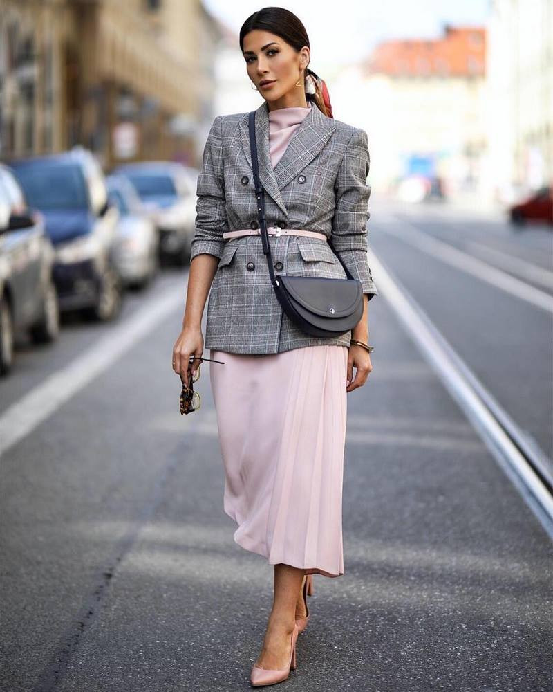 Оригинально выглядят изделия в клетку в многослойных луках, они замечательно сочетаются с пальто или тренчем. Женственный образ создается благодаря юбке плисе или летящему платью.