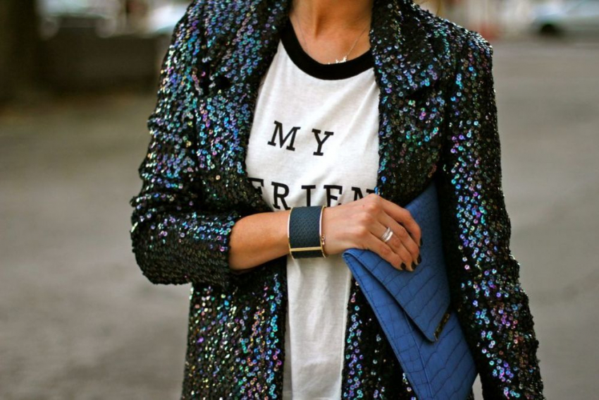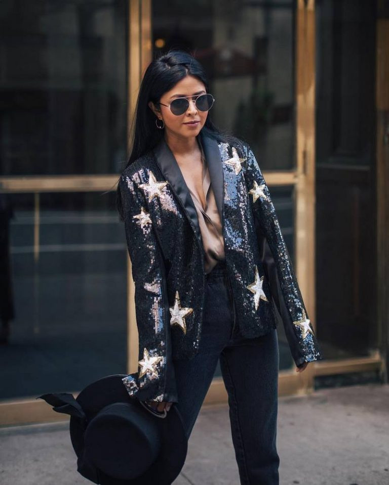 Модные женские пиджаки 2022 года создают не только повседневные образы, с ними может получиться прекрасный праздничный лук. Достаточно выбрать удлиненный пиджак, преображенный пайетками и принтом со звездами.