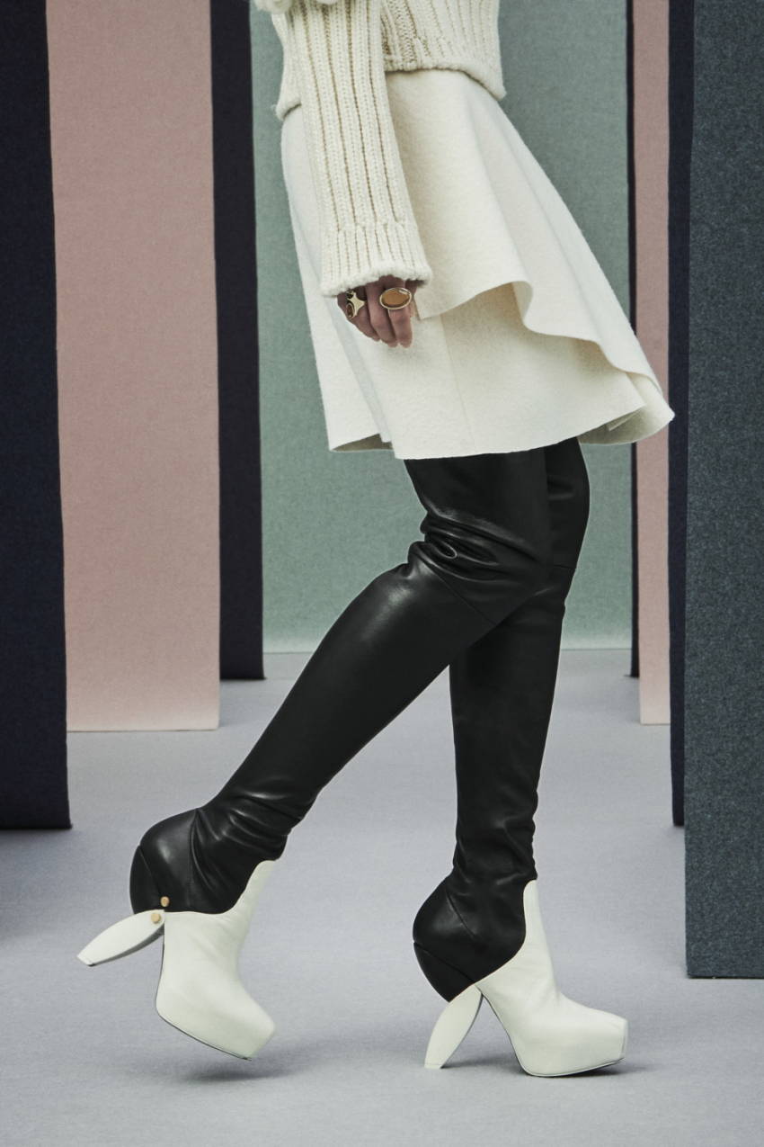 SchiaparelliОбувь на высокой платформе легко вписать в осенне-зимний гардероб, ведь она отлично сочетается как с кожаными брюками, джинсами клеш, мини-платьями, длинными рубашками и пышными юбками. Так, Loewe предлагают рифмовать кожаные лоферы на широкой платформе с имитацией носков с элегантными платьями, Balmain комбинируют ботфорты с увесистой подошвой с гольфами и шортами-бермудами, а Giambattista Valli сочетают дерзкие красные ботильоны в стиле 1970-х годов с мини-платьями с объемными руками, выполненными в технике пэчворк. Увидеть обувь на массивной платформе можно также в коллекции Simona Rocha в паре с романтичными юбками, у Schiaparelli подобные пары нашли себе союзника в виде элегантного пальто, а Ports 1961 удалось подружить шерстяные юбки и свитера с ботфортами-чулками с фигурным каблуком на скрытой платформе.