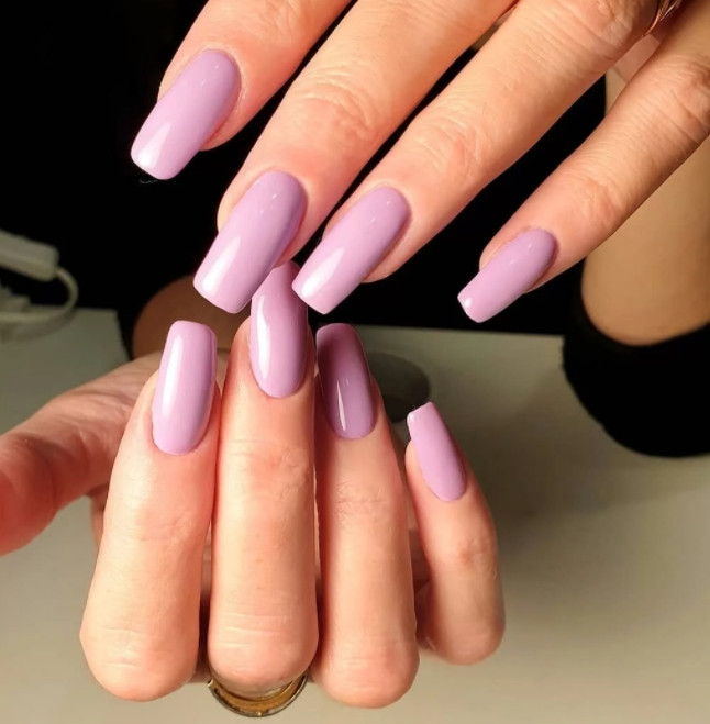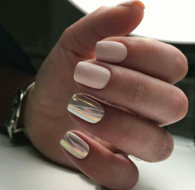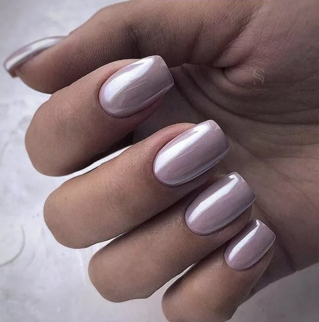 Модные ногти на весну 2021 имеют квадратную форму и могут быть отполированными до блеска. Они могут иметь оттенок серебристый металлик или быть окрашенными в переливающиеся на солнце голографические оттенки.
