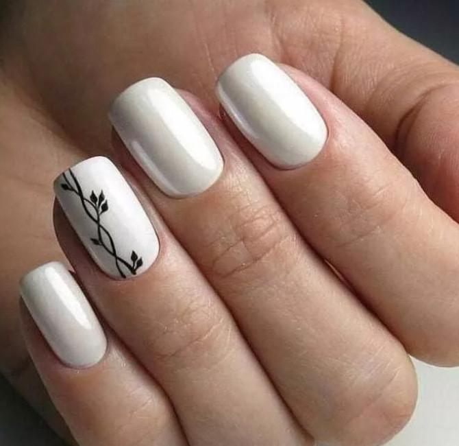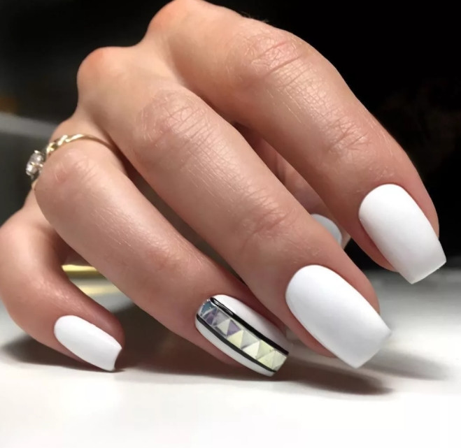 Выразительный белый цвет в матовом исполнении придаст вашему маникюру авангардный характер. Снежный цвет покрывает ногти и прекрасно гармонирует с романтичными и благородными тканями. Такой маникюр хорошо сочетается с шелковыми и кружевными платьями. В более изысканном варианте это классический французский маникюр, но с более широкими белыми полосами.