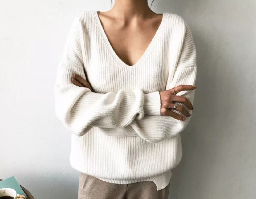 Это еще одна модель модного свитера на осень-зиму 2021-2022 гг., которая должна быть в каждом гардеробе. Такой свитер можно легко надеть на рубашку, если хочется разнообразить офисный наряд. Свитер с V-образным вырезом также можно носить задом наперед — тогда получится чувственный вырез, открывающий спину. Все зависит от того, как он сшит и можно ли его таким образом удобно надеть.