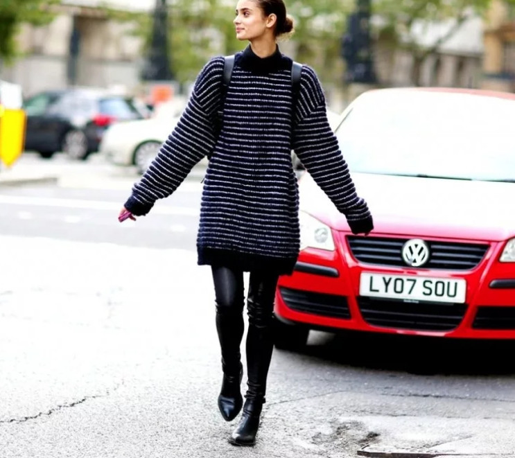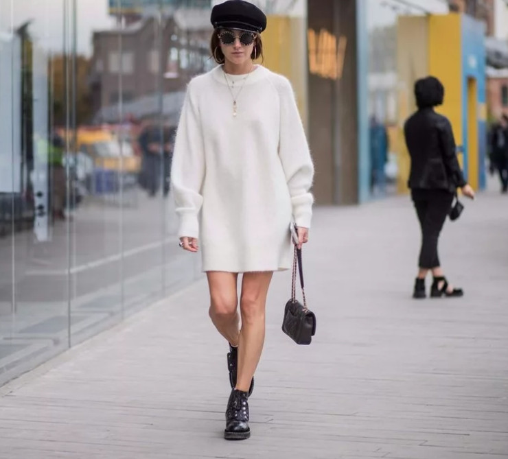 Это может быть платье-свитер с V-образным вырезом и капюшоном или длинный свитер с высоким воротом. Такое платье отлично смотрится, например, с длинными сапогами. Можно выбрать понравившийся пояс или какое-нибудь интересное украшение — и образ готов.