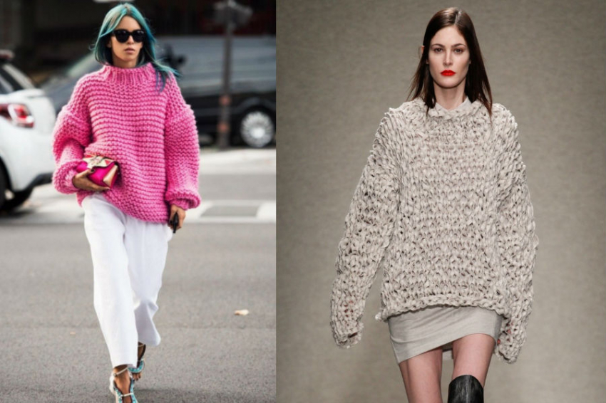 Большой объем касается не только рукавов, но и всего свитера. Такая одежда имеет много преимуществ: она чрезвычайно удобна, комфортна в носке. Эти свитера отлично смотрятся, например, на стройных девушках с маленькой грудью, а также на дамах с фигурой в форме яблока, поскольку скрывают выступающий живот, при этом обнажая стройные ноги.