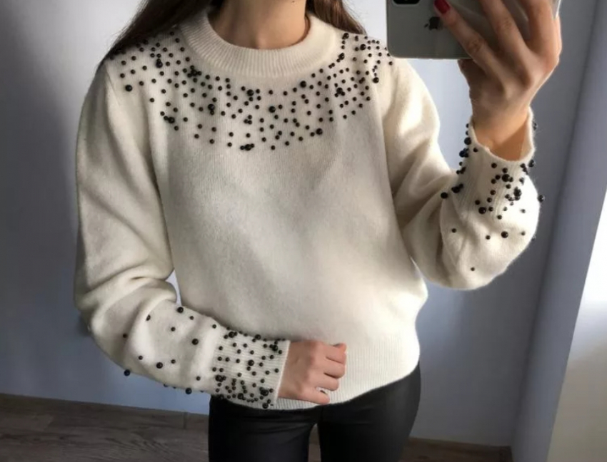 Эффектно смотрятся свитера с жемчугом. С их помощью можно создавать не только повседневные, но и деловые или праздничные комбинации. Эти модели хорошо сочетаются с брюками из экокожи.