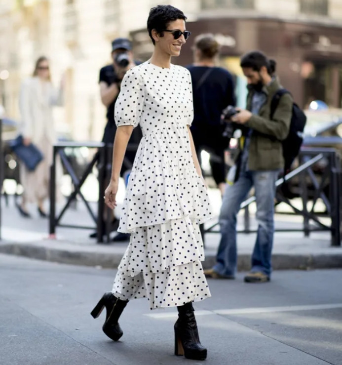 Ключевыми отличительными чертами этого летящего платья А-силуэта из мягкого материала стали: расширенный книзу подол, длинный рукав или три четверти, длина миди. В нынешнем сезоне эта модель легла в основу всевозможных деловых луков.