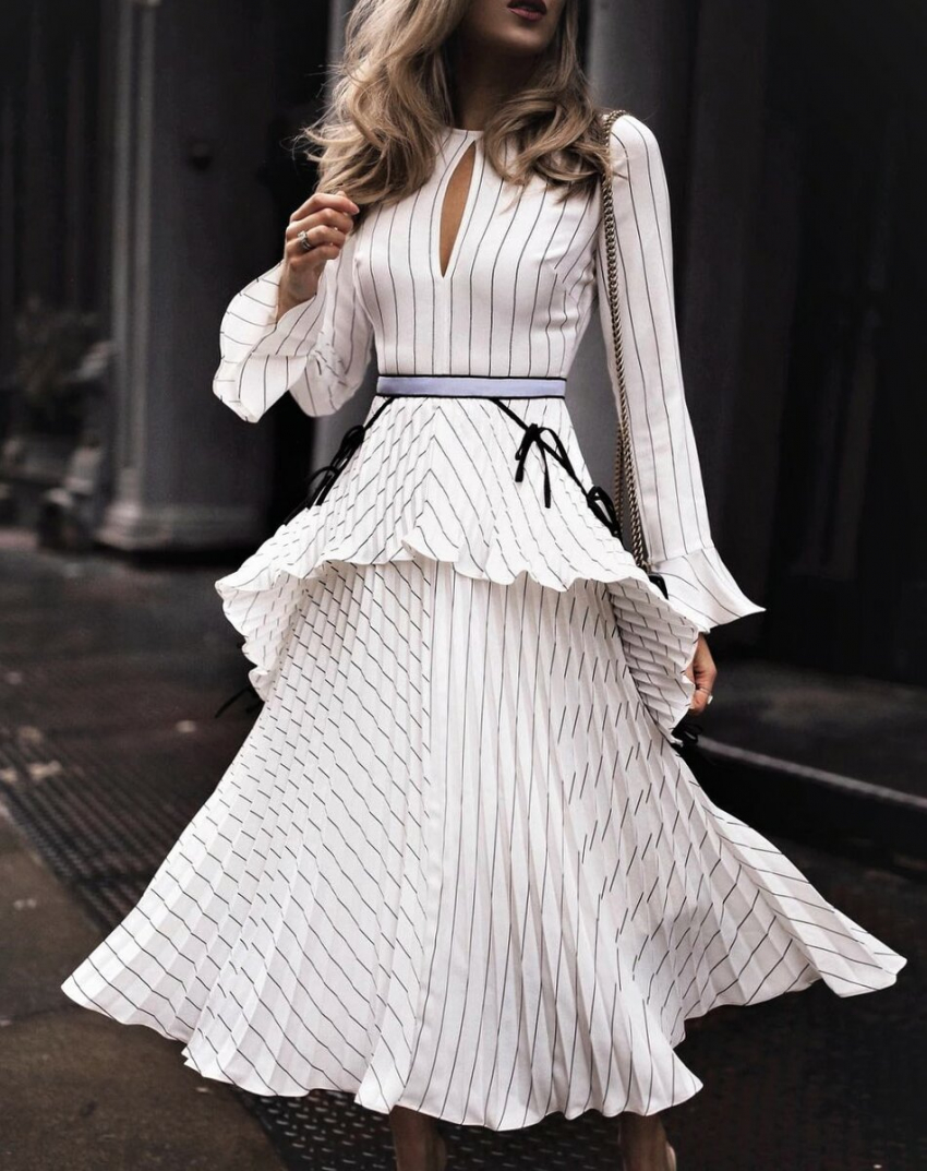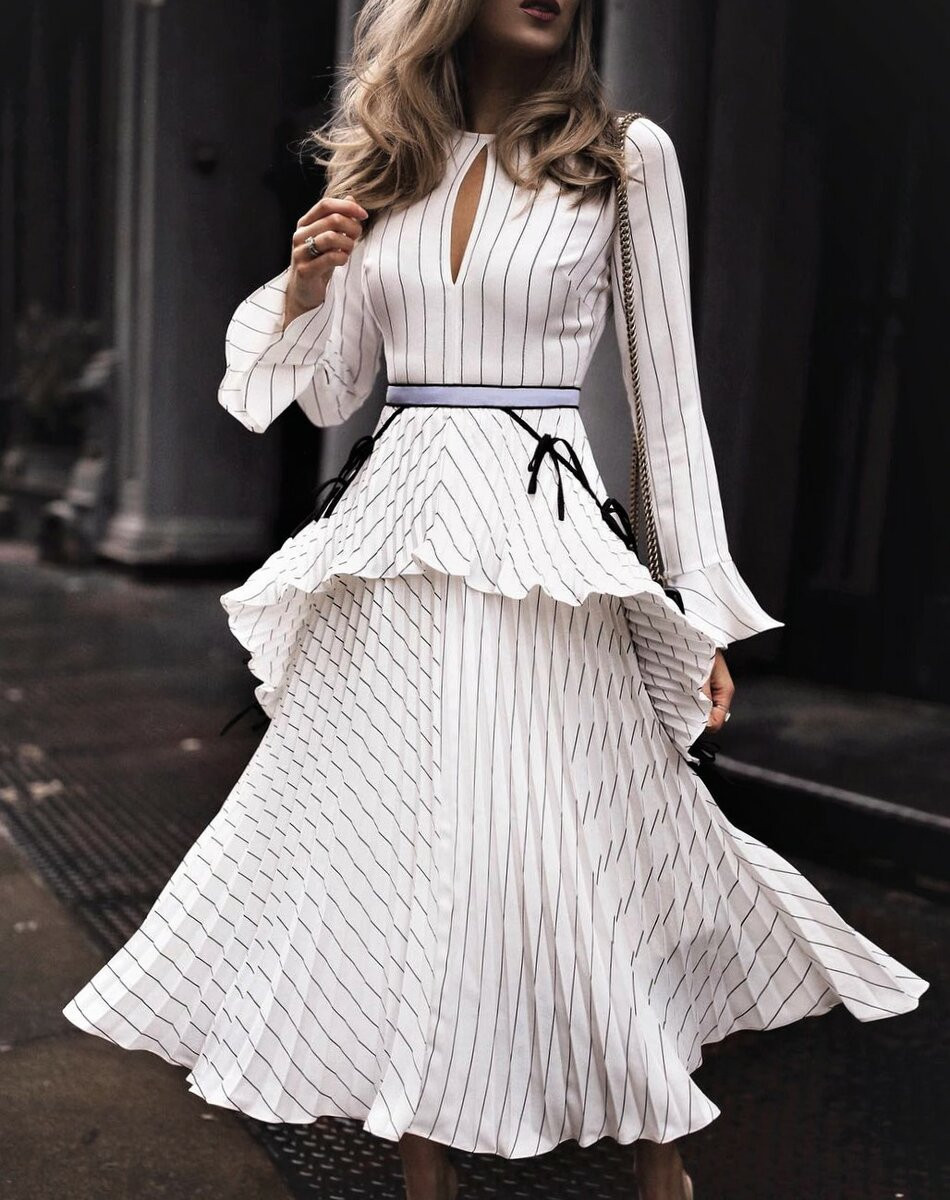 Знаменитые модные дома в сезоне 2021-2022 разработали модели деловых платьев, сопровождаемых мягкими воланами в зоне декольте и плиссированной юбкой. Выбирая подобный фасон, стоит следовать таким рекомендациям: